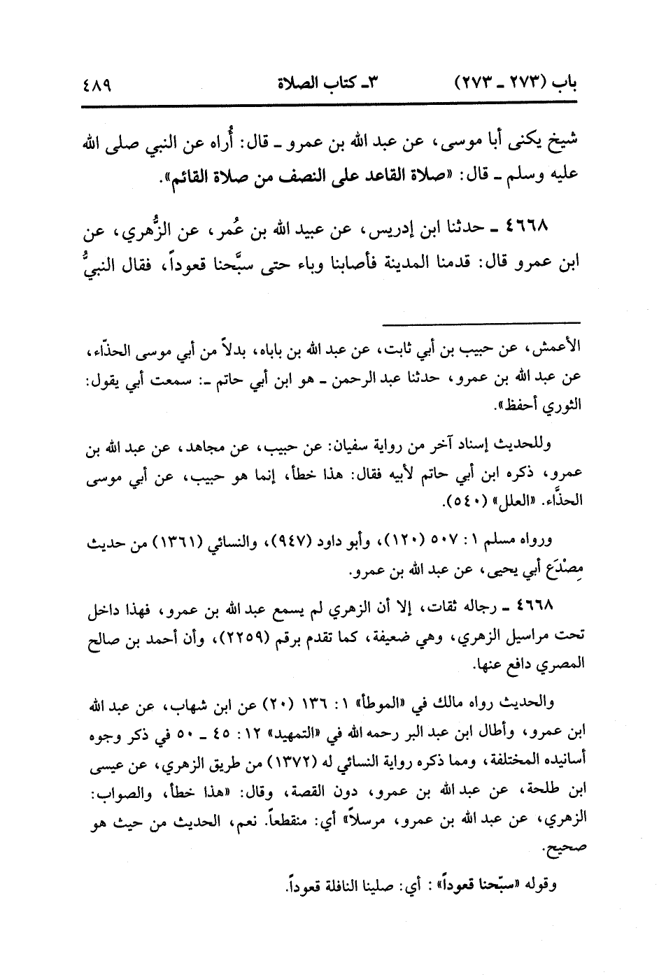 4668- حَدَّثَنَا ابْنُ إدْرِيسَ ، عَنْ عُبَيْدِ اللهِ بْنِ عُمَرَ ، عَنِ الزُّهْرِيِّ ، عَنِ ابْنِ عَمْرو ، قَالَ : قَدِمْنَا الْمَدِينَةَ فَأَصَابَنَا وَبَاءٌ حَتَّى سَبَّحْنَا قُعُودًا ، فَقَالَ النَّبِيُّ صَلَّى الله عَلَيْهِ وَسَلَّمَ : صَلاَةُ الْقَاعِدِ عَلَى النِّصْفِ مِنْ صَلاَةِ الْقَائِمِ. (2/52).