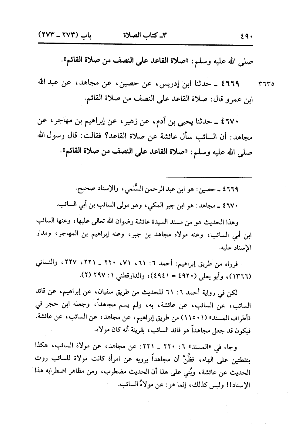 4670- حَدَّثَنَا يَحْيَى بْنُ آدَمَ ، عَنْ زُهَيْرٍ ، عَنْ إبْرَاهِيمَ بْنِ مُهَاجِرٍ ، عَنْ مُجَاهِدٍ : أَنَّ السَّائِبَ سَأَلَ عَائِشَةَ عَنْ صَلاَةِ الْقَاعِدِ ؟ فَقَالَتْ : قَالَ رَسُولُ اللهِ صَلَّى الله عَلَيْهِ وَسَلَّمَ : صَلاَةُ الْقَاعِدِ عَلَى النِّصْفِ مِنْ صَلاَةِ الْقَائِمِ. (2/52).