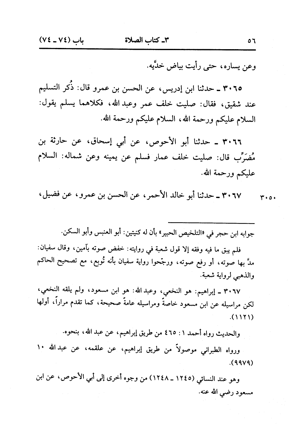 3067- حَدَّثَنَا أَبُو خَالِدٍ الأَحْمَرِِِ ، عَنِ الْحَسَنِ بْنِ عَمْرٍو ، عَنْ فُضَيْلٍ ، عَنْ إِبْرَاهِيمَ ، عَنْ عَبْدِ اللهِ ، قَالَ : كَأَنِّي أَنْظُرُ إلَى بَيَاضِ خَدِّ رَسُولِ اللهِ صَلَّى الله عَلَيْهِ وَسَلَّمَ سَلَّمَ حِينَ سَلَّمَ : السَّلاَمُ عَلَيْكُمْ وَرَحْمَةُ اللهِ ، السَّلاَمُ عَلَيْكُمْ وَرَحْمَةُ اللهِ. (1/299).