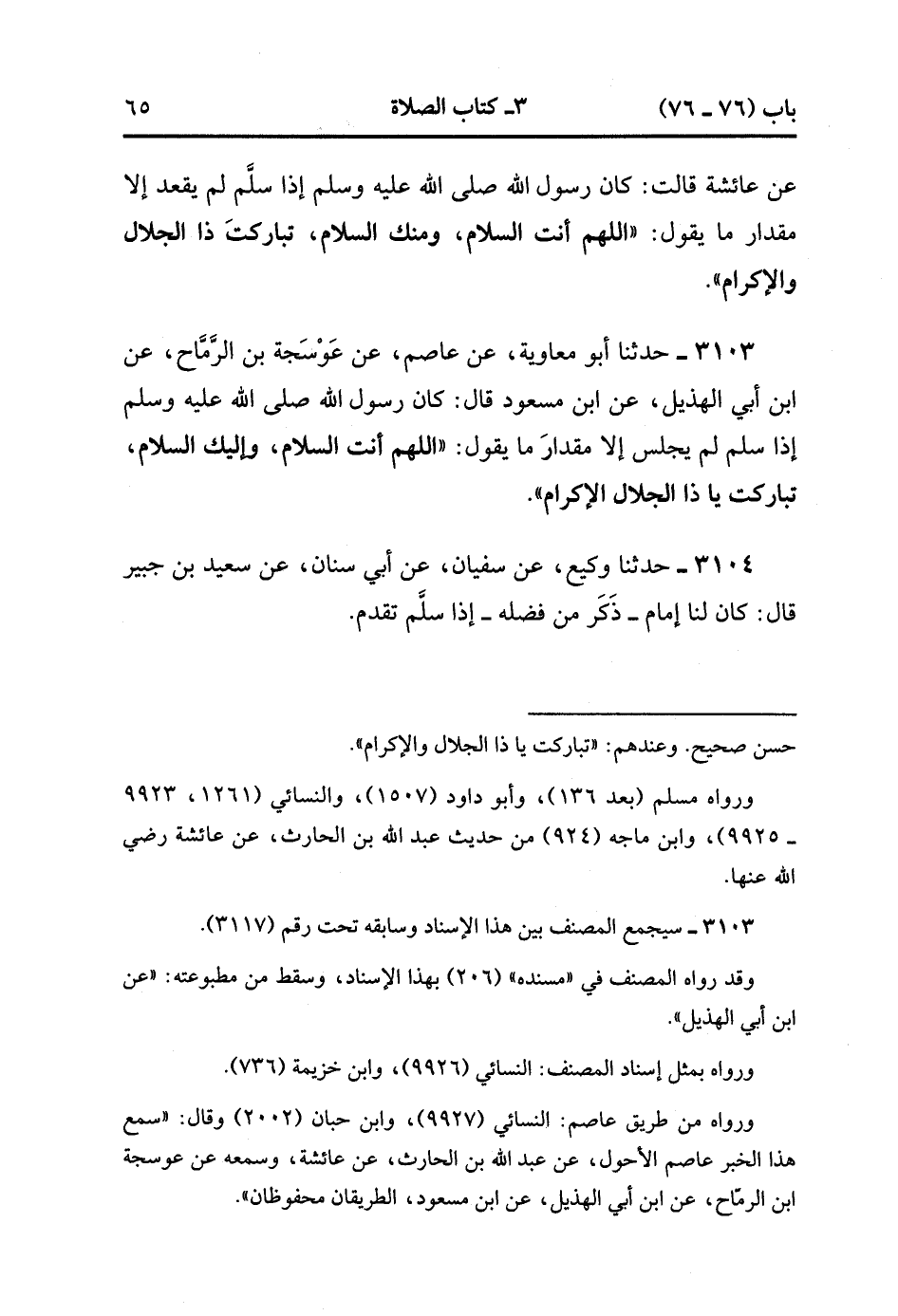 3103- حَدَّثَنَا أَبُو مُعَاوِيَةَ ، عَنْ عَاصِمٍ ، عَنْ عَوْسَجَةَ بْنِ الرَّمَّاحِ ، عَنِ ابْنِ أَبِي الْهُذَيْلِ ، عَنِ ابْنِ مَسْعُودٍ ، قَالَ : كَانَ رَسُولُ اللهِ صَلَّى الله عَلَيْهِ وَسَلَّمَ إذَا سَلَّمَ لَمْ يَجْلِسْ إِلاَّ مِقْدَارَ مَا يَقُولُ : اللَّهُمَّ أَنْتَ السَّلاَمُ ، وَإِلَيْكَ السَّلاَمُ ، تَبَارَكْتَ يَا ذَا الْجَلاَلِ وَالإِكْرَامِ.