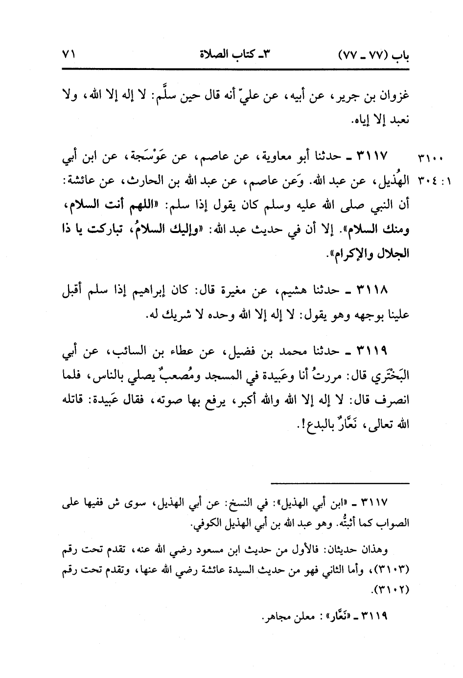 3117- حَدَّثَنَا أَبُو مُعَاوِيَةَ ، عَنْ عَاصِمٍ ، عَنْ عَوْسَجَةَ ، عَنِ ابْنِ أَبِي الْهُذَيْلِ ، عَنْ عَبْدِ اللهِ (ح) وَعَنْ عَاصِمٍ ، عَنْ عَبْدِ اللهِ بْنِ الْحَارِثِ ، عَنْ عَائِشَةَ ؛ أَنَّ النَّبِيَّ صَلَّى الله عَلَيْهِ وَسَلَّمَ كَانَ يَقُولُ إِذَا سَلَّمَ : اللَّهُمَّ أَنْتَ السَّلاَمُ وَمِنْك السَّلاَمُ. إِلاَّ أَنَّ فِي حَدِيثِ عَبْدِ اللهِ : وَإِلَيْك السَّلاَمُ تَبَارَكْت يَا ذَا الْجَلاَلِ وَالإِكْرَامِ.