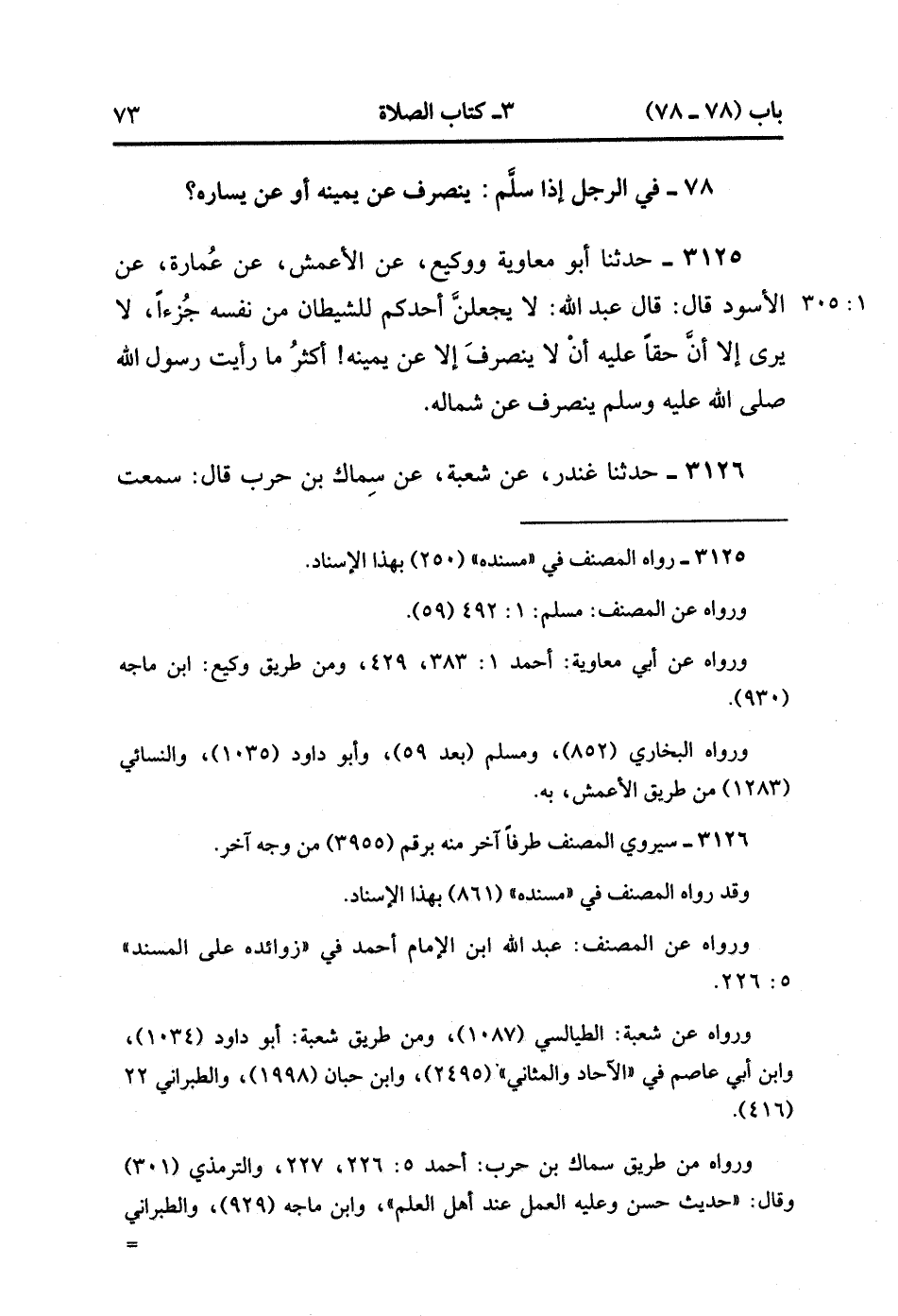 3125- حَدَّثَنَا أَبُو مُعَاوِيَةَ وَوَكِيعٌ ، عَنِ الأَعْمَشِ ، عَنْ عُمَارَةَ ، عَنِ الأَسْوَدِ ، قَالَ : قَالَ عَبْدُ اللهِ : لا يَجْعَلَنَّ أَحَدُكُمْ لِلشَّيْطَانِ مِنْ نَفْسِهِ جُزْءًا ، لا يَرَى إِلاَّ أَنَّ حَقًّا عَلَيْهِ أَنْ لا يَنْصَرِفَ إِلاَّ عَنْ يَمِينِهِ ، أَكْثَرُ مَا رَأَيْت رَسُولَ اللهِ صَلَّى الله عَلَيْهِ وَسَلَّمَ يَنْصَرِفُ عَنْ شِمَالِهِ. (1/304)