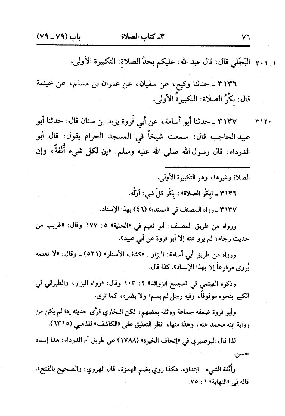 3137- حَدَّثَنَا أَبُو أُسَامَةَ ، عَنْ أَبِي فَرْوَةَ يَزِيدَ بْنِ سِنَانٍ , قَالَ : حدَّثَنَا أَبُو عُبَيْدٍ الْحَاجِبُ ، قَالَ : سَمِعْتُ شَيْخًا فِي الْمَسْجِدِ الْحَرَامِ يَقُولُ : قَالَ أَبُو الدَّرْدَاءِ : قَالَ رَسُولُ اللهِ صَلَّى الله عَلَيْهِ وَسَلَّمَ : إنَّ لِكُلِّ شَيْءٍ أُنْفَةً ، وَإِنَّ أُنْفَةَ الصَّلاَةِ التَّكْبِيرَةُ الأُولَى ، فَحَافِظُوا عَلَيْهَا.