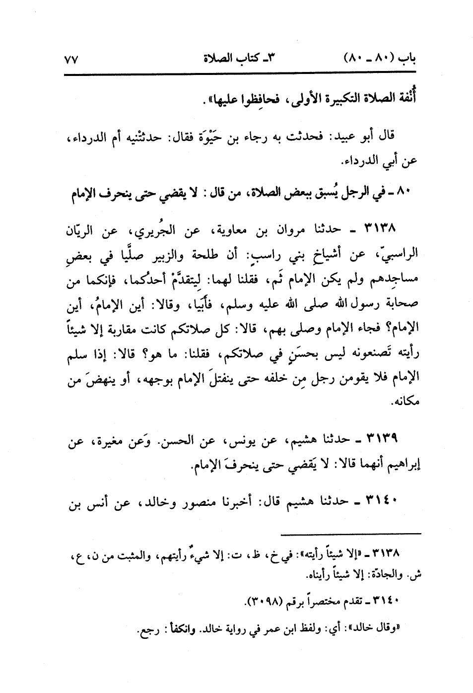 3138- حَدَّثَنَا مَرْوَانُ بْنُ مُعَاوِيَةَ ، عَنِ الْجَرِيرِيِّ ، عَنِ الرَّيَّانِ الرَّاسِبيِّ ، عَنْ أَشْيَاخِ بَنِي رَاسِبٍ : أَنَّ طَلْحَةَ وَالزُّبَيْرَ صَلَّيَا فِي بَعْضِ مَسَاجِدِهِمْ ، وَلَمْ يَكُنِ الإِمَامُ ثَمَّ ، فَقُلْنَا لَهُمَا : لِيَتَقَدَّمْ أَحَدُكُمَا ، فَإِنَّكُمَا مِنْ صَحَابَةِ رَسُولِ اللهِ صَلَّى الله عَلَيْهِ وَسَلَّمَ ، فَأَبَيَا وَقَالاَ : أَيْنَ الإِمَامُ ، أَيْنَ الإِمَامُ ؟ فَجَاءَ الإِمَامُ وَصَلَّى بِهِمْ ، قَالاَ : كُلُّ صَلاَتِكُمْ كَانَتْ مُقَارِبَةً إِلاَّ شَيْئًا رَأَيْتُهُ تَصْنَعُونَهُ ، لَيْسَ بِحَسَنٍ فِي صَلاَتِكُمْ ، فَقُلْنَا : مَا هُوَ ؟ قَالاَ : إذَا سَلَّمَ الإِمَامُ فَلاَ يَقُومَنَّ رَجُلٌ مِنْ خَلْفِهِ حَتَّى يَنْفَتِلَ الإِمَامُ بِوَجْهِهِ ، أَوْ يَنْهَضَ مِنْ مَكَانِهِ.