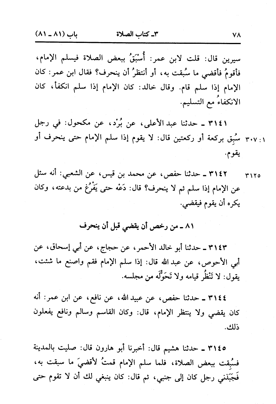3141- حَدَّثَنَا عَبْدُ الأَعْلَى ، عَنْ بُرْدٍ ، عَنْ مَكْحُولٍ ؛ فِي رَجُلٍ سُبِقَ بِرَكْعَةٍ أَوْ رَكْعَتَيْنِ ؟ قَالَ : لا يَقُومُ إذَا سَلَّمَ الإِمَامُ حَتَّى يَنْحَرِفَ أَوْ يَقُومَ. (1/306)