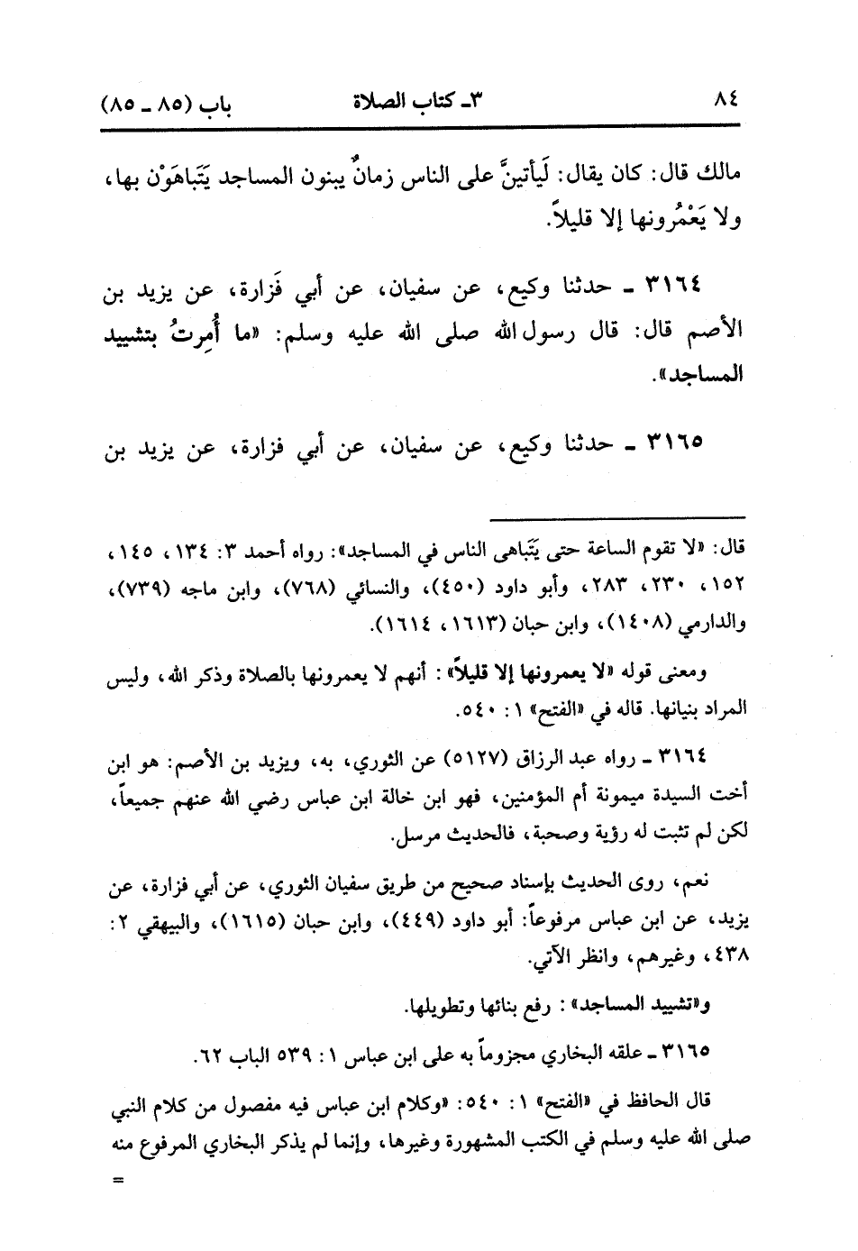 3165- حَدَّثَنَا وَكِيعٌ ، عَنْ سُفْيَانَ ، عَنْ أَبِي فَزَارَةَ ، عَنْ يَزِيدَ بْن الأَصَمِّ ، عَنِ ابْنِ عَبَّاسٍ ، قَالَ : لَتُزَخْرِفُنَّهَا كَمَا زَخْرَفَتِ الْيَهُودُ وَالنَّصَارَى. (1/309).