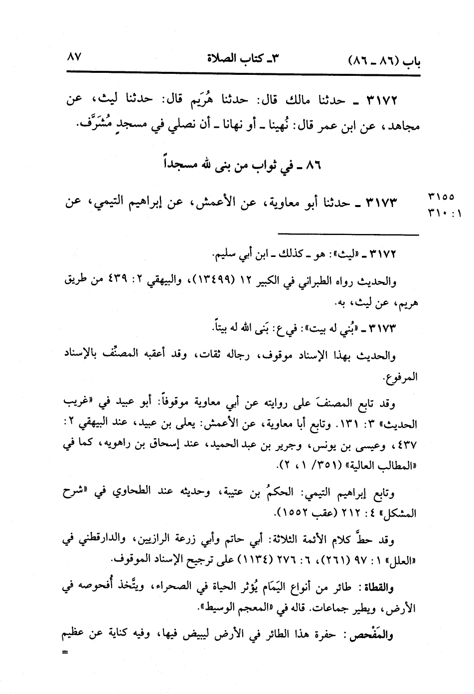 3172- حَدَّثَنَا مَالِكٌ , قَالَ : حدَّثَنَا هُرَيْمٌ ، قَالَ : حَدَّثَنَا لَيْثٌ ، عَنْ مُجَاهِدٍ ، عَنِ ابْنِ عُمَرَ ، قَالَ : نُهِينَا - أَوْ نَهَانَا - أَنْ نُصَلِّيَ فِي مَسْجِدٍ مُشَرَّفٍ. (1/309).