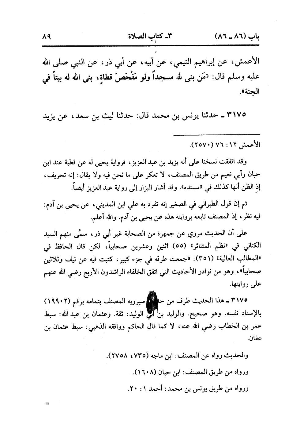 3174- حَدَّثَنَا يَحْيَى بْنُ آدَمَ , قَالَ : حدَّثَنَا يَزِيدُ بْنُ عَبْدِ الْعَزِيزِ ، عَنِ الأَعْمَشِ ، عَنْ إبْرَاهِيمَ التَّيْمِيِّ ، عَنْ أَبِيهِ ، عَنْ أَبِي ذَرٍّ ، عَنِ النَّبِيِّ صَلَّى الله عَلَيْهِ وَسَلَّمَ ، قَالَ : مَنْ بَنَى لِلَّهِ مَسْجِدًا وَلَوْ مَفْحَصَ قَطَاةٍ ، بَنَى اللَّهُ لَهُ بَيْتًا فِي الْجَنَّةِ. (1/310).
