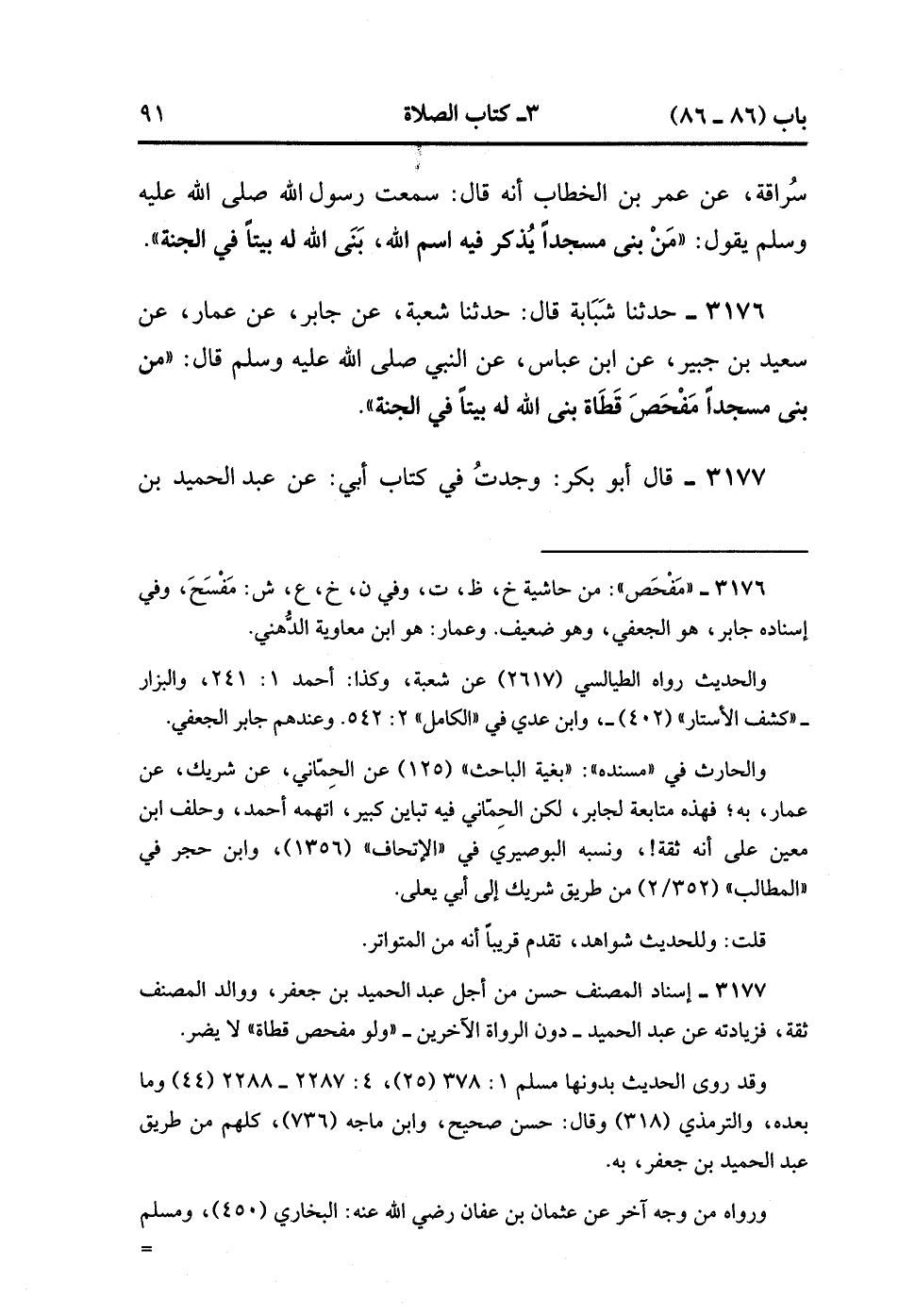 3177- قَالَ أَبو بَكر : وَجَدْتُ فِي كِتَابِ أَبِي : عَنْ عَبْدِ الْحَمِيدِ بْنِ جَعْفَرٍ ، عَنْ أَبِيهِ ، عَنْ مَحْمُودِ بْنِ لَبِيدٍ ، عَنْ عُثْمَانَ ، عَنِ النَّبِيِّ صَلَّى الله عَلَيْهِ وَسَلَّمَ قَالَ : مَنْ بَنَى مَسْجِدًا وَلَوْ مَفْحَصَ قَطَاةٍ ، بَنَى اللَّهُ لَهُ بَيْتًا فِي الْجَنَّةِ. (1/310).