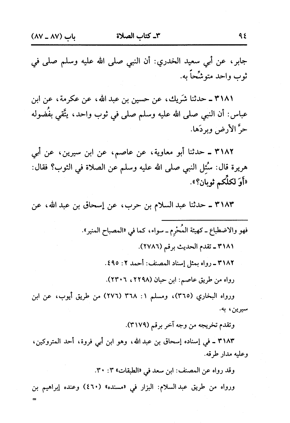 3182- حَدَّثَنَا أَبُو مُعَاوِيَةَ ، عَنْ عَاصِمٍ ، عَنِ ابْنِ سِيرِينَ ، عَنْ أَبِي هُرَيْرَةَ ، قَالَ : سُئِلَ النَّبِيُّ صَلَّى الله عَلَيْهِ وَسَلَّمَ عَنِ الصَّلاَةِ فِي الثَّوْبِ ؟ فَقَالَ : أَو لِكُلِّكُمْ ثَوْبَانِ ؟. (1/311).