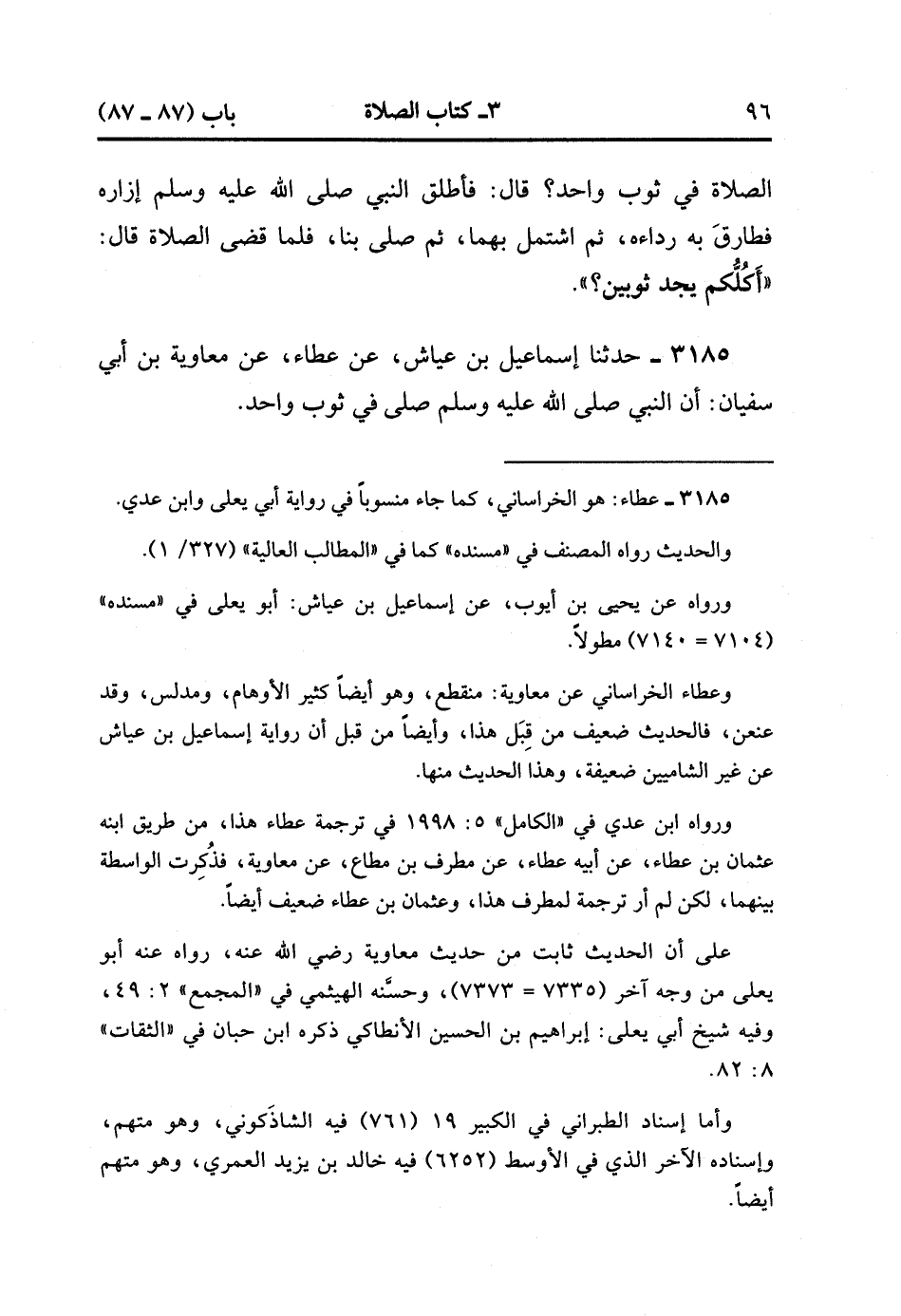 3185- حَدَّثَنَا إسْمَاعِيلُ بْنُ عَيَّاشٍ ، عَنْ عَطَاءٍ ، عَنْ مُعَاوِيَةَ بْنِ أَبِي سُفْيَانَ : أَنَّ النَّبِيَّ صَلَّى الله عَلَيْهِ وَسَلَّمَ صَلَّى فِي ثَوْبٍ وَاحِدٍ. (1/311).