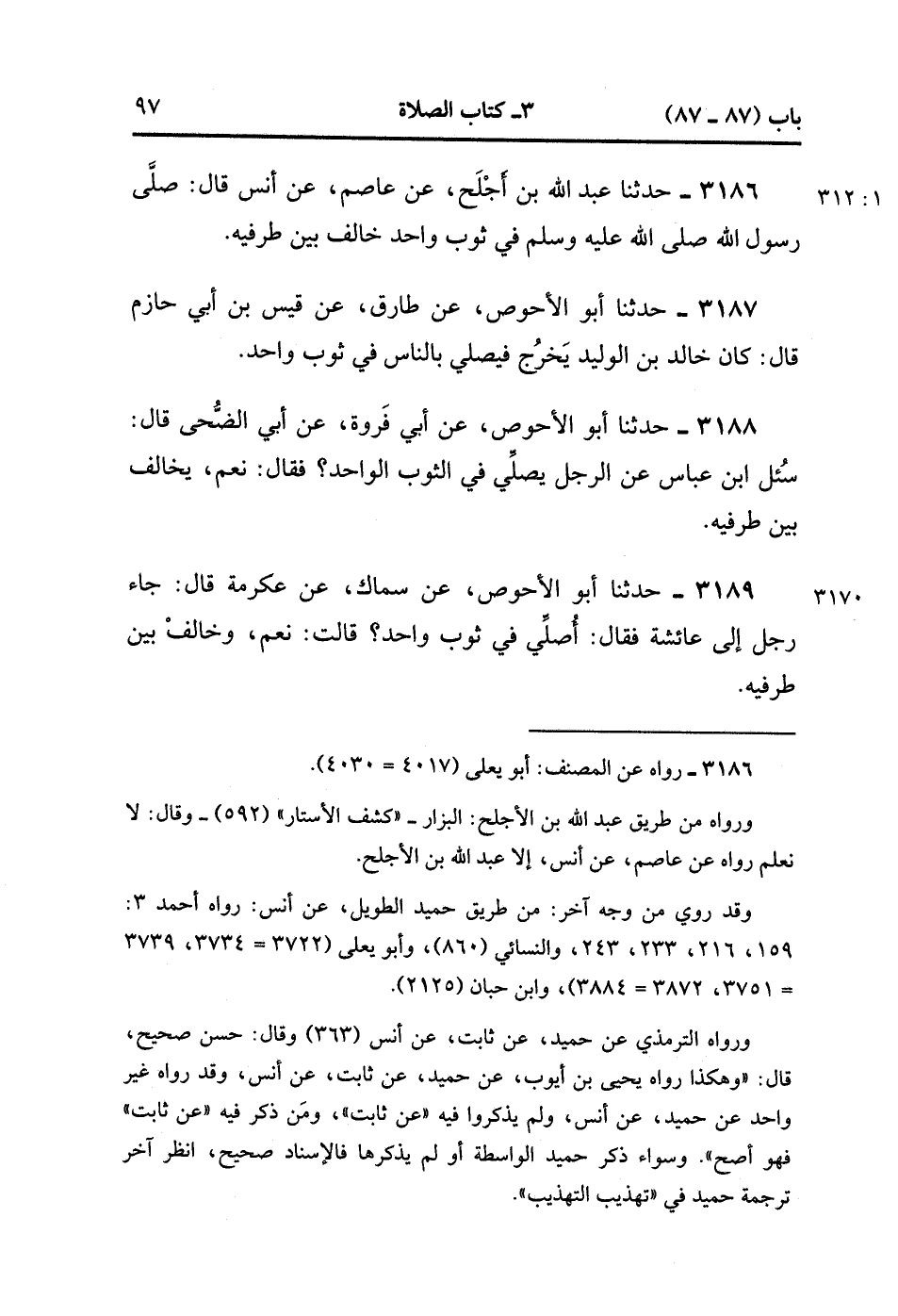 3186- حَدَّثَنَا عَبْدُ اللهِ بْنُ أَجْلَح ، عَنْ عَاصِمٍ ، عَنْ أَنَسٍ ، قَالَ : صَلَّى رَسُولُ اللهِ صَلَّى الله عَلَيْهِ وَسَلَّمَ فِي ثَوْبٍ وَاحِدٍ خَالَفَ بَيْنَ طَرَفَيْهِ. (1/311)