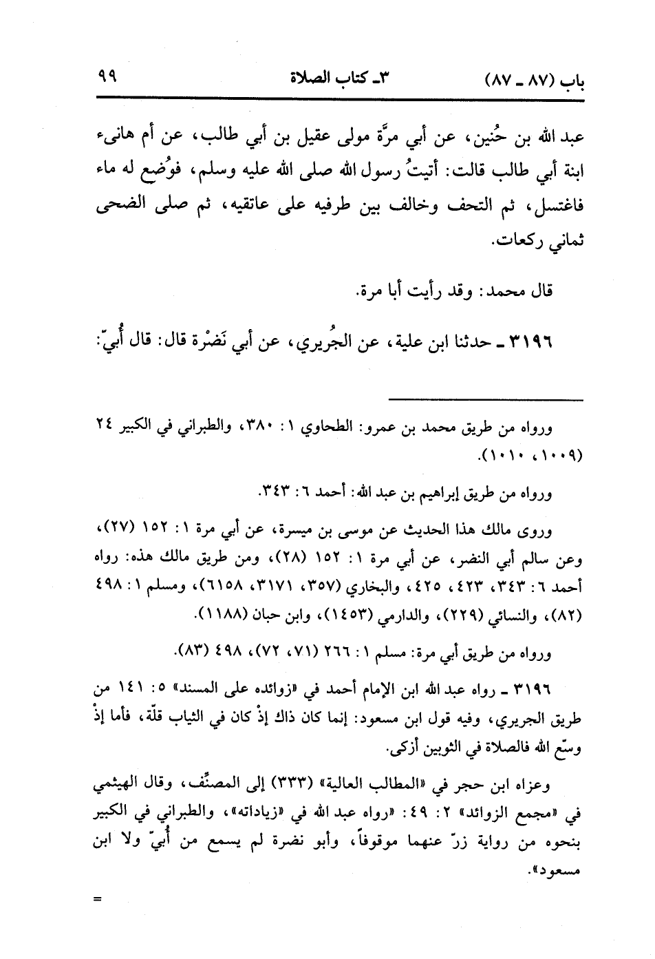 3195- حَدَّثَنَا يَزِيدُ بْنُ هَارُونَ ، عَنْ مُحَمَّدِ بْنِ عَمْرٍو ، عَنْ إبْرَاهِيمَ بْنِ عَبْدِ اللهِ بْنِ حُنَيْنٍ ، عَنْ أَبِي مُرَّةَ مَوْلَى عَقِيلِ بْنِ أَبِي طَالِبٍ ، عَنْ أُمِّ هَانِىءٍ ابْنَةِ أَبِي طَالِبٍ ، قَالَتْ : أَتَيْتُ رَسُولَ اللهِ صَلَّى الله عَلَيْهِ وَسَلَّمَ فَوُضِعَ لَهُ مَاءٌ فَاغْتَسَلَ ، ثُمَّ الْتَحَفَ وَخَالَفَ بَيْنَ طَرَفَيْهِ عَلَى عَاتِقَيْهِ ، ثُمَّ صَلَّى الضُّحَى ثَمَانِيَ رَكَعَاتٍ.