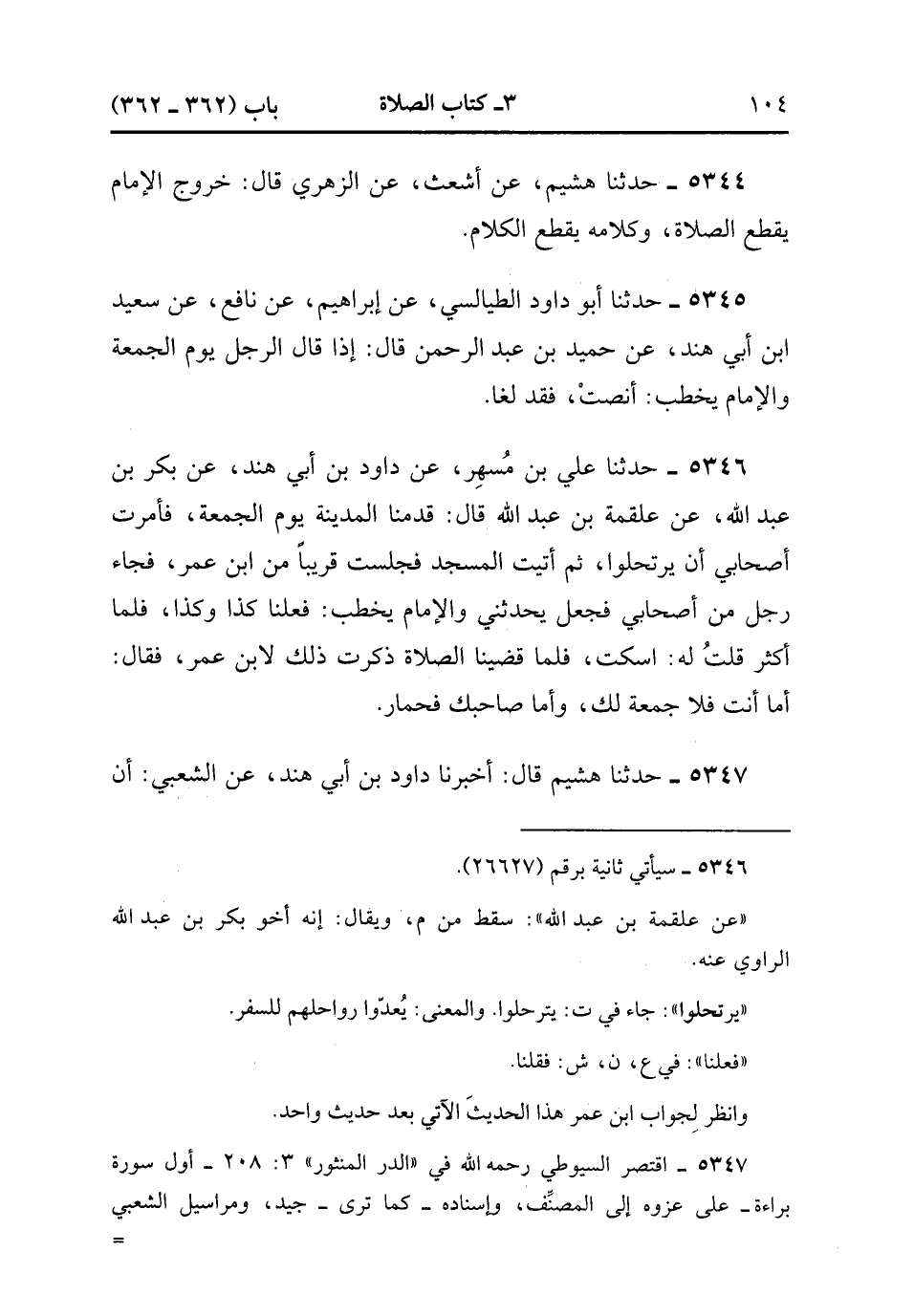 5346- حَدَّثَنَا عَلِيُّ بْنُ مُسْهِرٍ ، عَنْ دَاوُدَ بْنِ أَبِي هِنْدٍ ، عَنْ بَكْرِ بْنِ عَبْدِ اللهِ ، عَنْ عَلْقَمَةَ بْنِ عَبْدِ اللهِ ، قَالَ : قدِمْنَا الْمَدِينَةَ يَوْمَ الْجُمُعَةِ ، فَأَمَرْتُ أَصْحَابِي أَنْ يَرْتَحِلُوا ، ثُمَّ أَتَيْتُ الْمَسْجِدَ ، فَجَلَسْتُ قَرِيبًا مِنَ ابْنِ عُمَرَ ، فَجَاءَ رَجُلٌ مِنْ أَصْحَابِي ، فَجَعَلَ يُحَدِّثُنِي وَالإِمَامُ يَخْطُبُ ، فَعلْنَا كَذَا وَكَذَا ، فَلَمَّا أَكْثَرَ قُلْتُ لَهُ : اسْكُتْ ، فَلَمَّا قَضَيْنَا الصَّلاَة ذَكَرْتُ ذَلِكَ لاِبْنِ عُمَرَ ، فَقَالَ : أَمَّا أَنْتَ فَلاَ جُمُعَةَ لَكَ ، وَأَمَّا صَاحِبُك فَحِمَارٌ. (2/125).