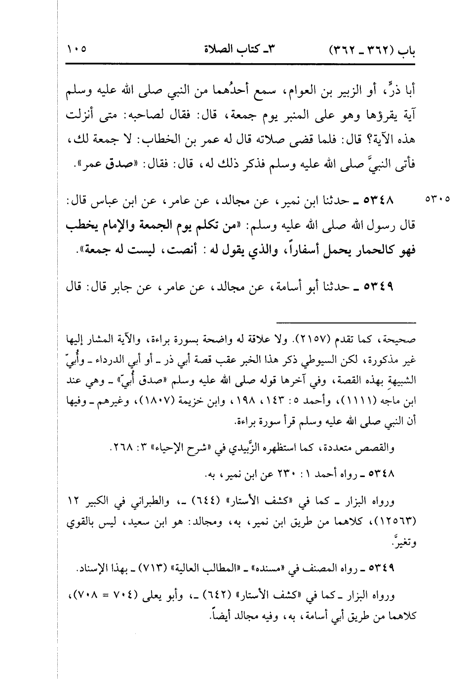 5348- حَدَّثَنَا ابْنُ نُمَيْرٍ ، عَنْ مُجَالِدٍ ، عَنْ عَامِرٍ ، عَنِ ابْنِ عَبَّاسٍ ، قَالَ : قَالَ رَسُولُ اللهِ صَلَّى الله عَلَيْهِ وَسَلَّمَ : مَنْ تَكَلَّمَ يَوْمَ الْجُمُعَةِ وَالإِمَامُ يَخْطُبُ فَهُوَ كَالْحِمَارِ يَحْمِلُ أَسْفَارًا ، وَالَّذِي يَقُولُ لَهُ أَنْصِتْ لَيْسَتْ لَهُ جُمُعَةٌ.