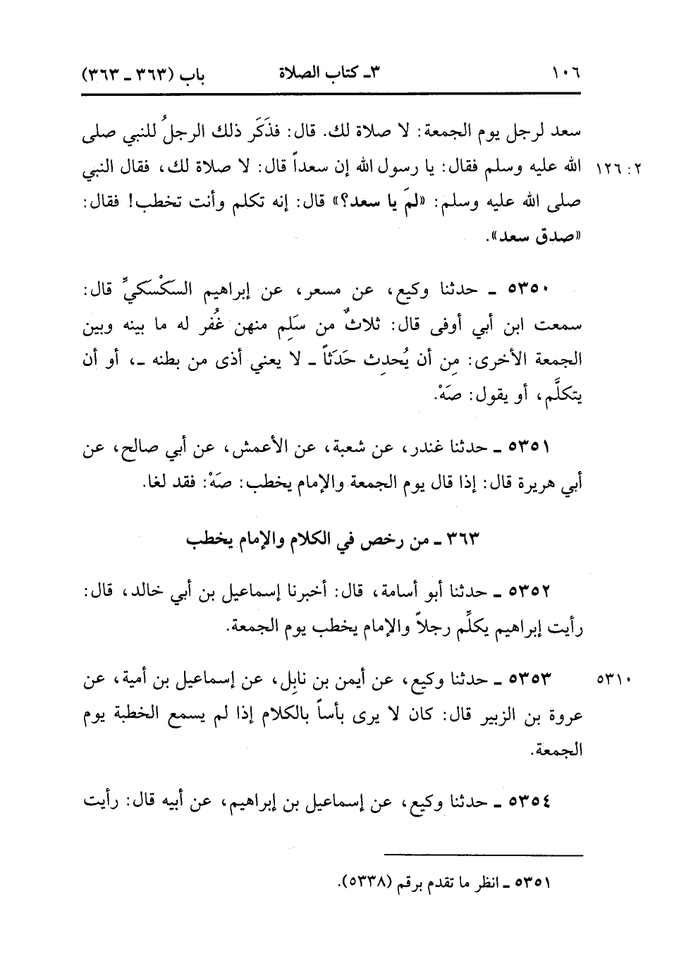 5352- حَدَّثَنَا أَبُو أُسَامَةَ , قَالَ : أَخْبَرَنَا إِسْمَاعِيلُ بْنُ أَبِي خَالِدٍ ، قَالَ : رَأَيْتُ إِبْرَاهِيمَ يُكَلِّمُ رَجُلاً وَالإِمَام يَخْطُبُ يَوْمَ الْجُمُعَةِ.