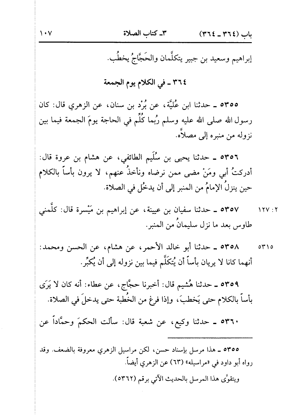 5360- حَدَّثَنَا وَكِيعٌ ، عَنْ شُعْبَةَ ، قَالَ : سَأَلْتُ الْحَكَمَ ، وَحَمَّادًا عَنِ الْكَلاَمِ إِذَا خَرَجَ الإِمَام حَتَّى يَتَكَلَّمَ ، وَإِذَا نَزَلَ قَبْلَ أَنْ يُصَلِّيَ ؟ فَكَرِهَهُ الْحُكْمُ ، وَقَالَ حَمَّادٌ : لاَ بَأْسَ بِهِ. (2/127).