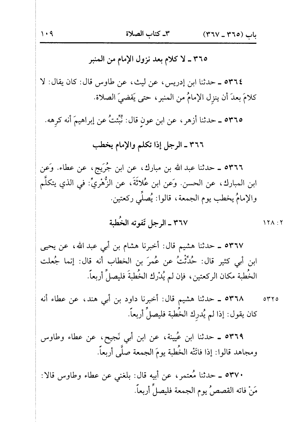 5366- حَدَّثَنَا عَبْدُ اللهِ بْنُ مُبَارَكٍ ، عَنِ ابْنِ جُرَيْجٍ ، عَنْ عَطَاءٍ (ح) وَعَنِ ابْنِ الْمُبَارَكِ ، عَنِ الْحَسَنِ (ح) وَعَنِ ابْنِ عُلاَثَةَ ، عَنِ الزُّهْرِيِّ ؛ فِي الَّذِي يَتَكَلَّمُ وَالإِمَامُ يَخْطُبُ يَوْمَ الْجُمُعَةِ ، قَالُوا : يُصَلِّي رَكْعَتَيْنِ. (2/127)