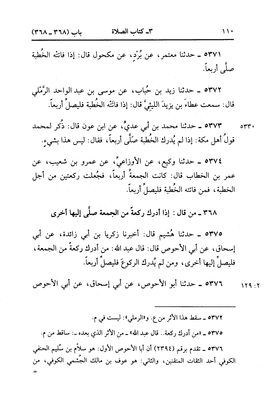 5376- حَدَّثَنَا أَبُو الأَحْوَصِ ، عَنْ أَبِي إِسْحَاقَ ، عَنْ أَبِي الأَحْوَص ، قَالَ : قَالَ عَبْدُ اللهِ : مَنْ أَدْرَكَ الْجُمُعَةَ فَهِيَ رَكْعَتَانِ ، وَمَنْ لَمْ يُدْرِكْ فَلْيُصَلِّ أَرْبَعًا. (2/128).