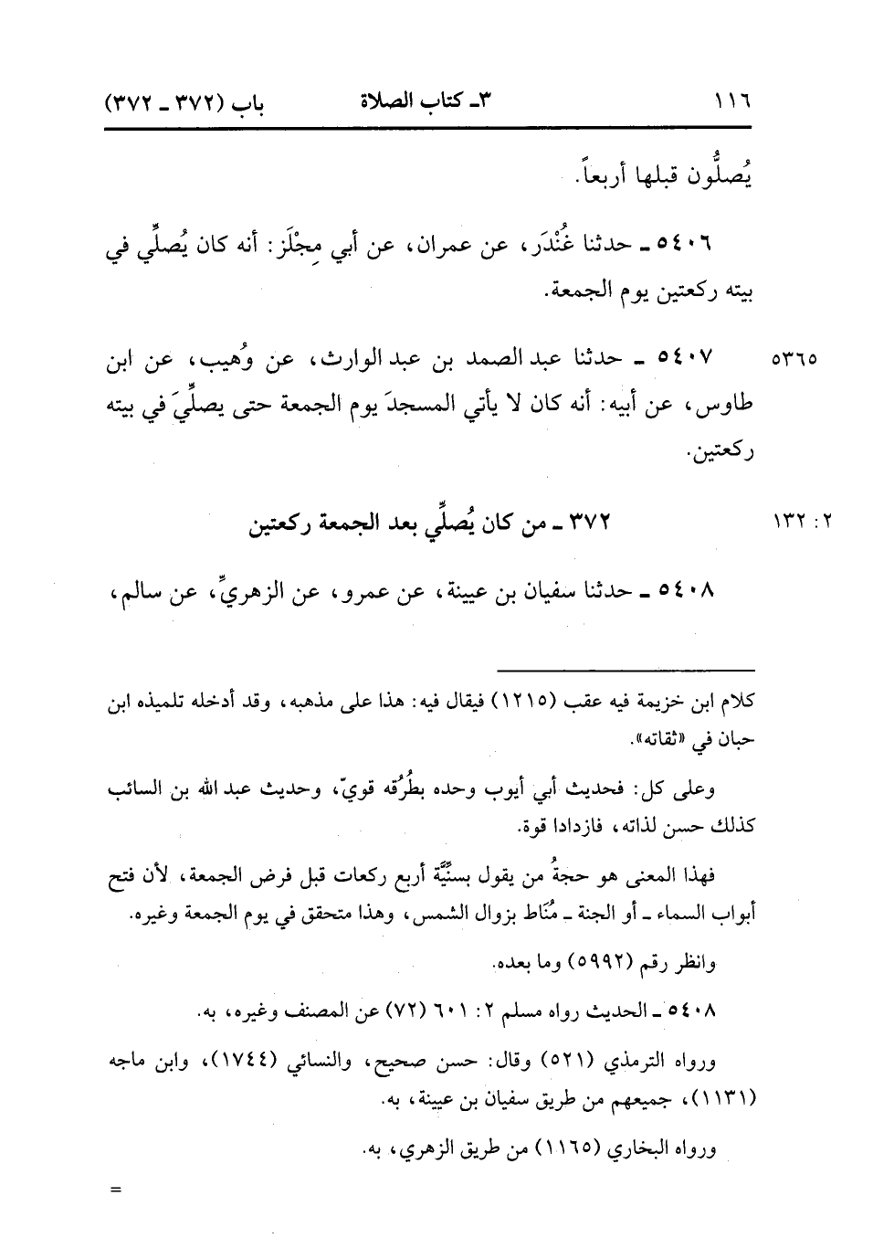 5408- حَدَّثَنَا سُفْيَانُ بْنُ عُيَيْنَةَ ، عَنْ عَمْرٍو ، عَنِ الزُّهْرِيِّ ، عَنْ سَالِمٍ ، عَنِ ابْنِ عُمَرَ ؛ أَنَّ النَّبِيَّ صَلَّى الله عَلَيْهِ وَسَلَّمَ كَانَ يُصَلِّي بَعْدَ الْجُمُعَةِ رَكْعَتَيْنِ. (2/132).