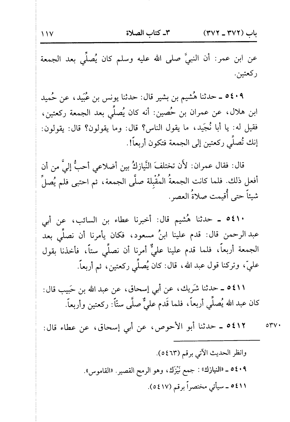5409- حَدَّثَنَا هُشَيْمُ بْنُ بَشِيرٍ , قَالَ : حدَّثَنَا يُونُسُ بْنُ عُبَيْدٍ ، عَنْ حُمَيْدِ بْنِ هِلاَلٍ ، عَنْ عِمْرَانَ بْنِ حُصَيْنٍ ؛ أَنَّهُ كَانَ يُصَلِّي بَعْدَ الْجُمُعَةِ رَكْعَتَيْنِ ، فَقِيلَ لَهُ : يَا أَبَا نُجَيْدٍ ، مَا يَقُولُ النَّاسُ ؟ قَالَ : وَمَا يَقُولُونَ ؟ قَالَ : يَقُولُونَ : إِنَّك تُصَلِّي رَكْعَتَيْنِ إِلَى الْجُمُعَةِ فَتَكُونُ أَرْبَعًا.