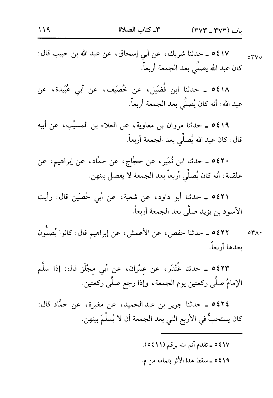 5424- حَدَّثَنَا جَرِيرٌ بن عَبْدِ الْحَمِيدِ ، عَنْ مُغِيرَةَ ، عَنْ حَمَّادٍ ، قَالَ : كَانَ يُسْتَحَبُّ فِي الأَرْبَعِ الَّتِي بَعْدَ الْجُمُعَةِ أَنْ لاَ يُسَلَّمَ بَيْنَهُنَّ. (2/133).