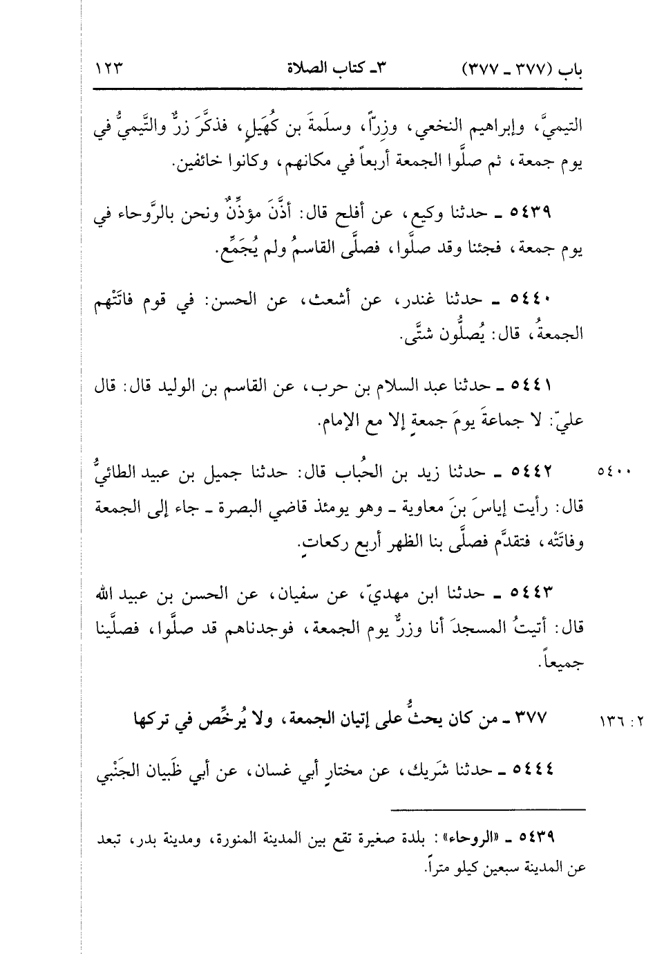 5439- حَدَّثَنَا وَكِيعٌ ، عَنْ أَفْلَحَ ، قَالَ : أَذَّنَ مُؤَذِّنٌ وَنَحْنُ بِالرَّوْحَاءِ فِي يَوْمِ جُمُعَةٍ ، فَجِئْنَا وَقَدْ صَلَّوْا ، فَصَلَّى الْقَاسِمُ وَلَمْ يُجَمِّعْ.