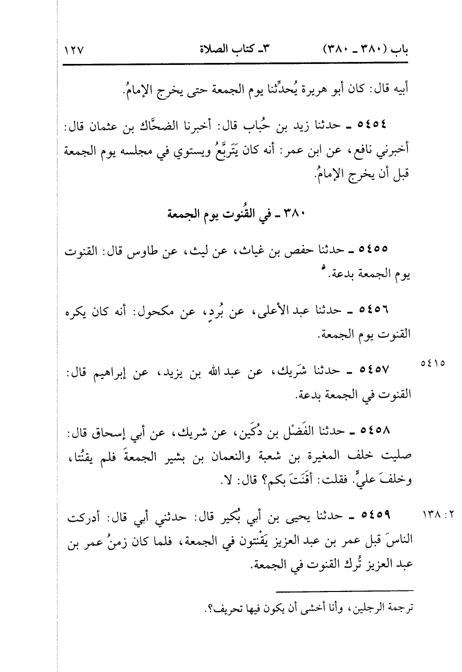 5459- حَدَّثَنَا يَحْيَى بْنُ أَبِي بُكَيْرٍ ، قَالَ : حَدَّثَنِي أَبِي ، قَالَ : أَدْرَكْتُ النَّاسَ قَبْلَ عُمَرَ بْنِ عَبْدِ الْعَزِيزِ يَقْنُتُونَ فِي الْجُمُعَةِ ، فَلَمَّا كَانَ زَمَنُ عُمَرَ بْنِ عَبْدِ الْعَزِيزِ تُرِكَ الْقُنُوتُ فِي الْجُمُعَةِ. (2/137).