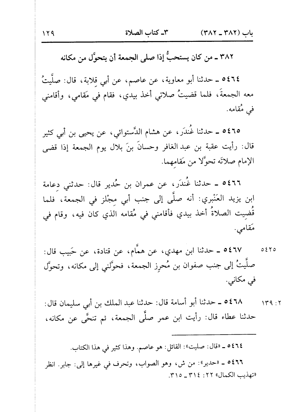 5465- حَدَّثَنَا غُنْدَرٌ ، عَنْ هِشَامٍ الدَّسْتُوَائِيِّ ، عَنْ يَحْيَى بْنِ أَبِي كَثِيرٍ ، قَالَ : رَأَيْتُ عُقْبَةَ بْنَ عبْدِ الْغَافِرِ ، وَحَسَّانَ بْنَ بِلاَلٍ يَوْمَ الْجُمُعَةِ إِذَا قَضَى الإِمَامُ صَلاَتَهُ تَحَوَّلاَ مِنْ مَقَامِهِمَا.