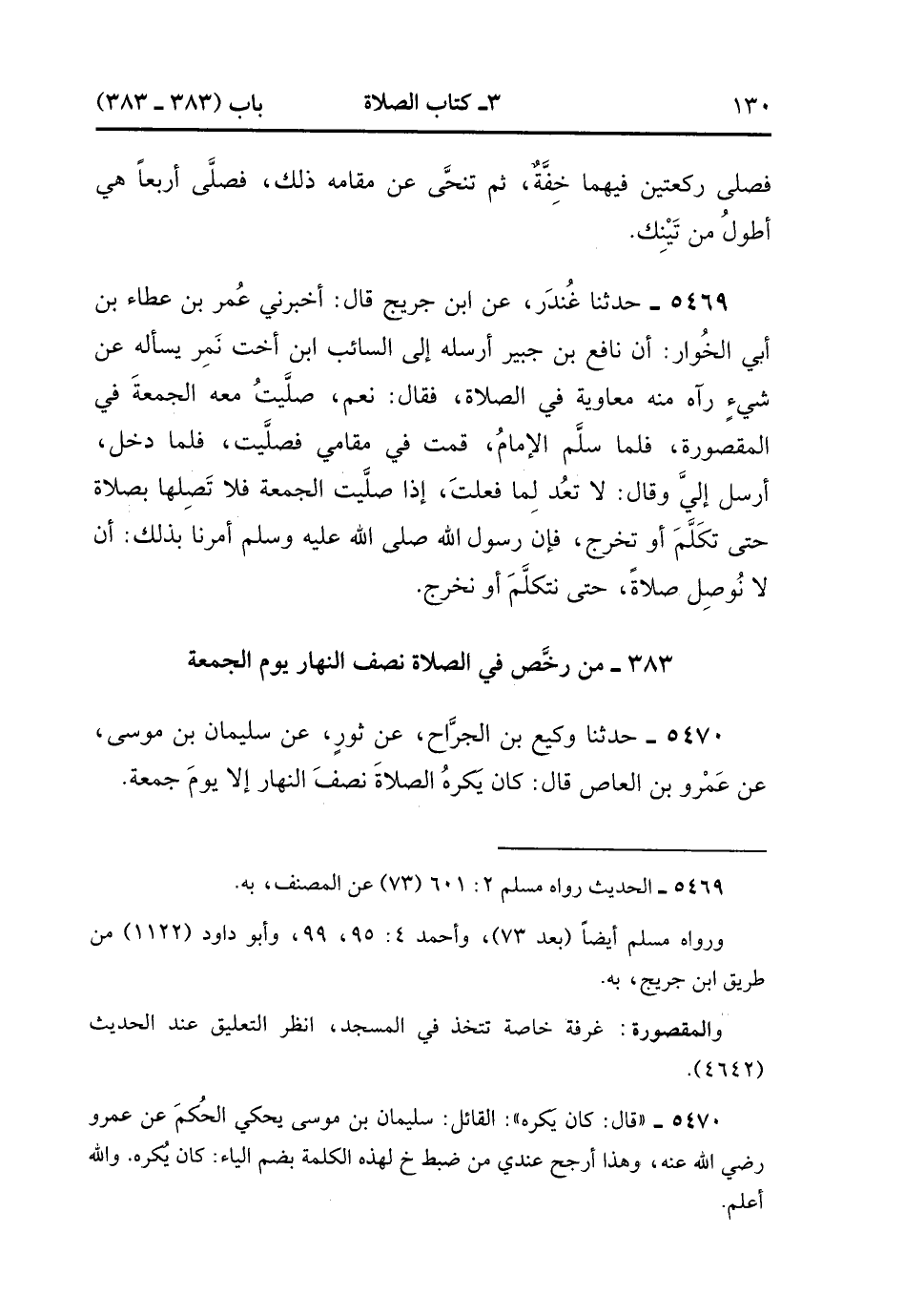 5469- حَدَّثَنَا غُنْدَرٌ ، عَنِ ابْنِ جُرَيْجٍ ، قَالَ : أَخْبَرَنِي عُمَرُ بْنُ عَطَاءِ بْنِ أَبِي الْخُوَارِ ؛ أَنَّ نَافِعَ بْنَ جُبَيْرٍ أَرْسَلَهُ إِلَى السَّائِبِ ابْنِ أُخْتِ نَمِرٍ ، يَسْأَلُهُ عَنْ شَيْءٍ رَآهُ مِنْهُ مُعَاوِيَةُ فِي الصَّلاَةِ ، فَقَالَ : نَعَمْ ، صَلَّيْتُ مَعَهُ الْجُمُعَةَ فِي الْمَقْصُورَةِ ، فَلَمَّا سَلَّمَ الإِمَامُ قُمْتُ فِي مَ قَامِي فَصَلَّيْتُ ، فَلَمَّا دَخَلَ أَرْسَلَ إِلَيَّ ، وَقَالَ : لاَ تَعُدْ لِمَا فَعَلْتَ ، إِذَا صَلَّيْتَ الْجُمُعَةَ فَلاَتَصِلْهَا بِصَلاَةٍ حَتَّى تَكَلَّمَ ، أَوْ تَخْرُجَ ، فَإِنَّ رَسُولَ اللهِ صَلَّى الله عَلَيْهِ وَسَلَّمَ أَمَرَنَا بِذَلِكَ : أَنْ لاَ تُوصِلَ صَلاَةً حَتَّى نَتَكَلَّمُ ، أَوْ نَخْرُجُ.