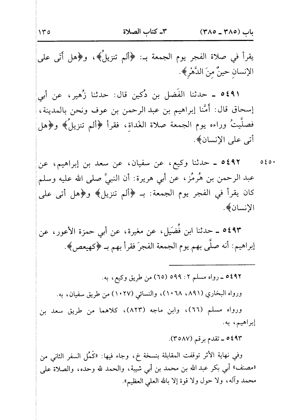 5492- حَدَّثَنَا وَكِيعٌ ، عَنْ سُفْيَانَ ، عَنْ سَعْدِ بْنِ إِبْرَاهِيمَ ، عَنْ عَبْدِ الرَّحْمَنِ بْنِ هُرْمُزَ ، عَنْ أَبِي هُرَيْرَةَ ؛ أَنَّ النَّبِيَّ صَلَّى الله عَلَيْهِ وَسَلَّمَ كَانَ يَقْرَأُ فِي الْفَجْرِ يَوْمَ الْجُمُعَةِ بِـ : {الم تَنْزِيلُ} ، وَ{هَلْ أَتَى عَلَى الإِنْسَاْن}.