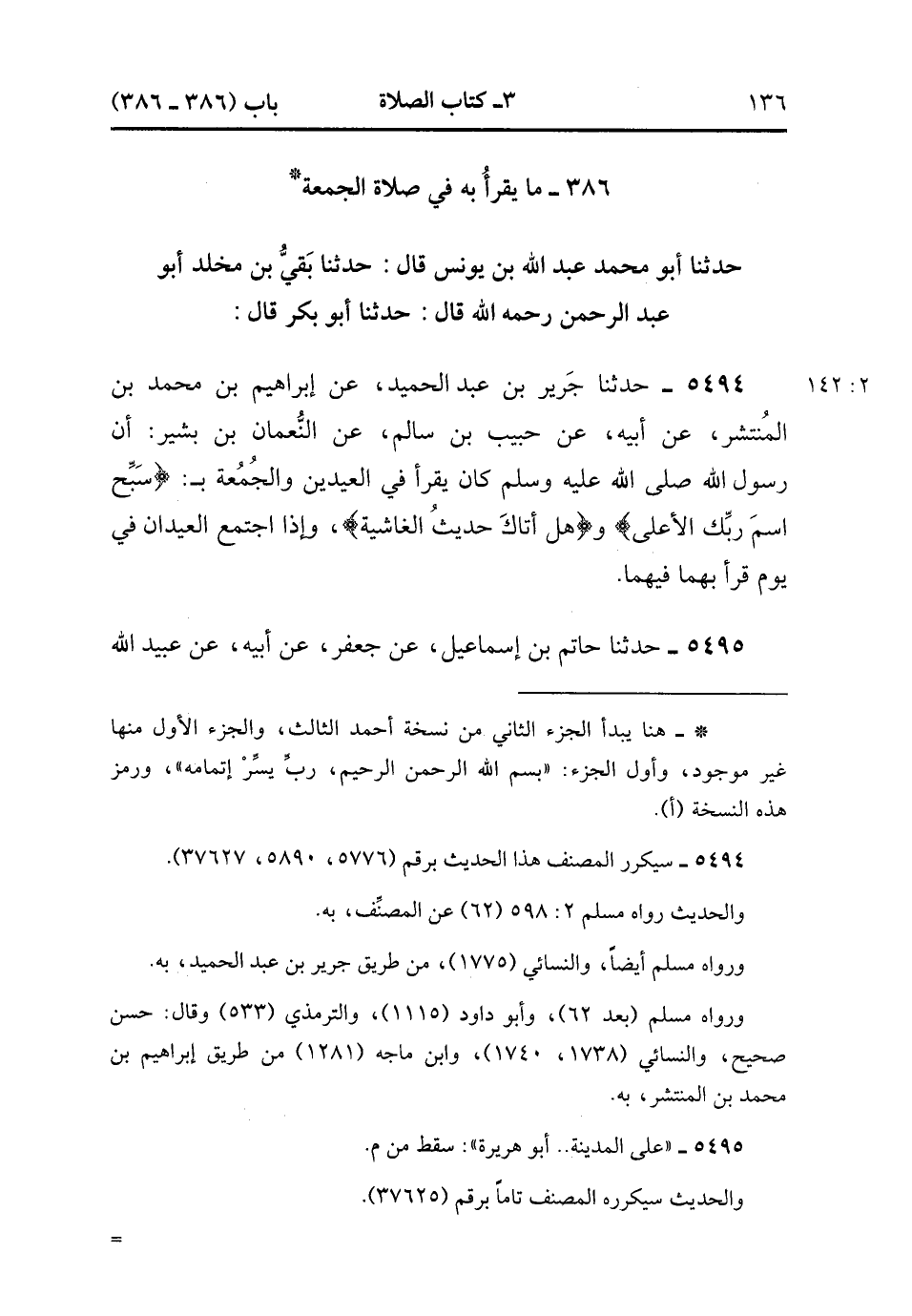 5494- حَدَّثَنَا جَرِيرُ بْنُ عَبْدِ الْحَمِيدِ ، عَنْ إِبْرَاهِيمَ بْنِ مُحَمَّدٍ بن الْمُنْتَشِرِ ، عَنْ أَبِيهِ ، عَنْ حَبِيبِ بْنِ سَالِمٍ ، عَنِ النُّعْمَانِ بْنِ بَشِيرٍ ؛ أَنَّ رَسُولَ اللهِ صَلَّى الله عَلَيْهِ وَسَلَّمَ كَانَ يَقْرَأُ فِي الْعِيدَيْنِ وَالْجُمُعَةِ بِـ : {سَبِّحِ اسْمَ رَبِّكَ الأَعْلَى} ، وَ{هَلْ أَتَاكَ حَدِيثُ الْغَاشِيَةِ} وَإِذَا اجْتَمَعَ الْعِيدَانِ فِي يَوْمٍ ، قَرَأَ بِهِمَا فِيهِمَا. (2/141)