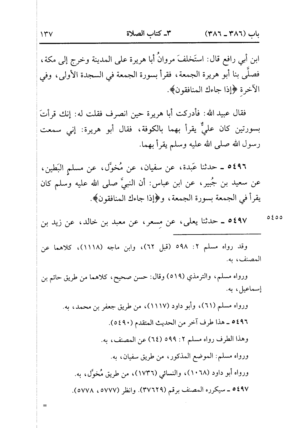 5496- حَدَّثَنَا عَبْدَةُ ، عَنْ سُفْيَانَ ، عَنْ مُخَوَّلٍ ، عَنْ مُسْلِمٍ الْبَطِينِ ، عَنْ سَعِيدِ بْنِ جُبَيْرٍ ، عَنِ ابْنِ عَبَّاسٍ ؛ أَنَّ النَّبِيَّ صَلَّى الله عَلَيْهِ وَسَلَّمَ كَانَ يَقْرَأُ فِي الْجُمُعَةِ بِسُورَةِ الْجُمُعَةِ ، وَ{إِذَا جَاءَكَ الْمُنَافِقُونَ}.