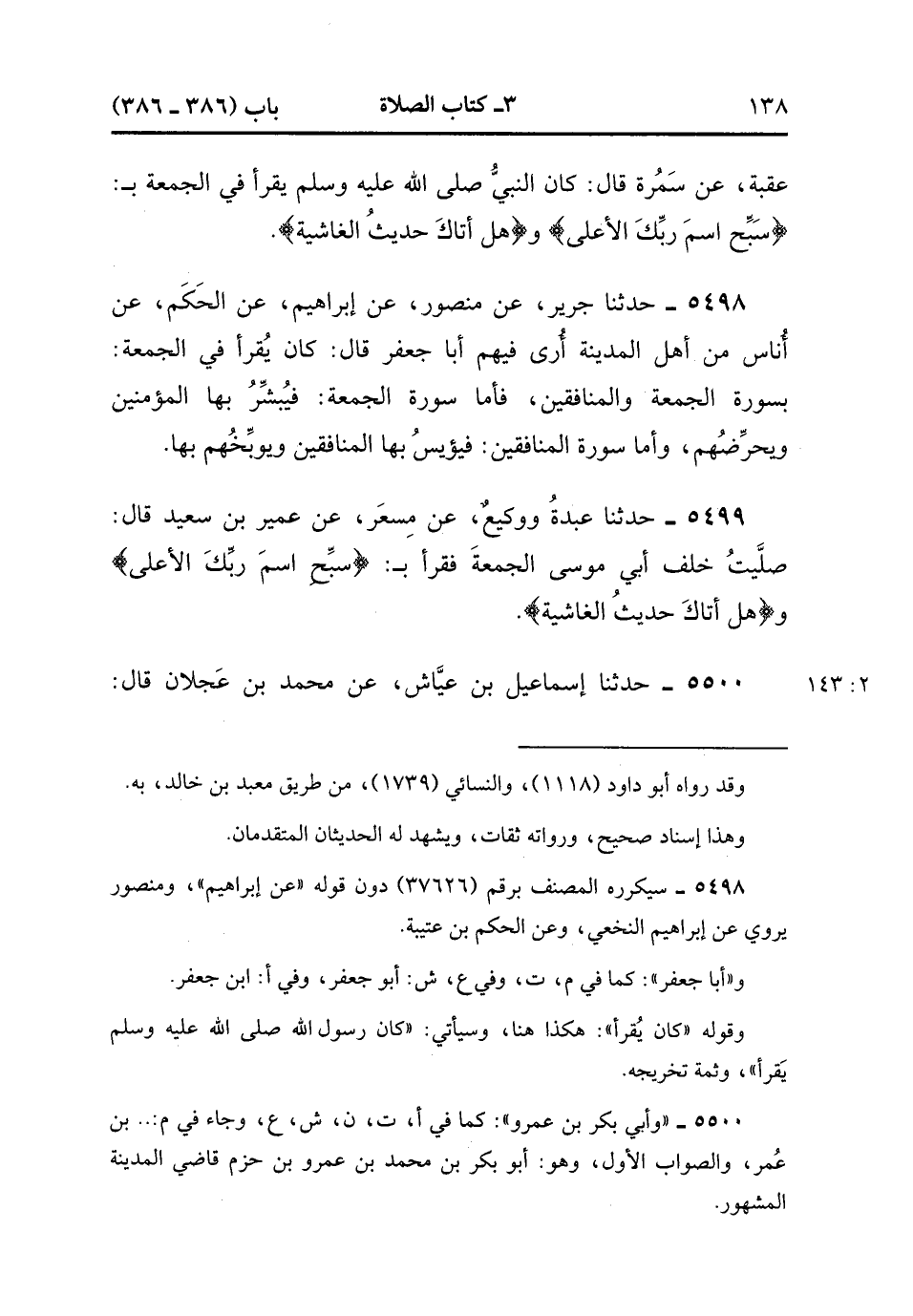 5500- حَدَّثَنَا إِسْمَاعِيلُ بْنُ عَيَّاشٍ ، عَنْ مُحَمَّدِ بْنِ عَجْلاَنَ ، قَالَ : صَلَّيْتُ خَلْفَ عُمَرَ بْنِ عَبْدِ الْعَزِيزِ ، وَأَبِي بَكْرِ بْنِ عَمْرٍو الْجُمُعَةَ ، فَقَرَآ فِي الرَّكْعَةِ الأُولَى بِسُورَةِ الْجُمُعَةِ ، وَفِي الرَّكْعَةِ الثَّانِيَةِ بِـ : {سَبِّحِ اسْمَ رَبِّكَ الأَعْلَى}. (2/143).