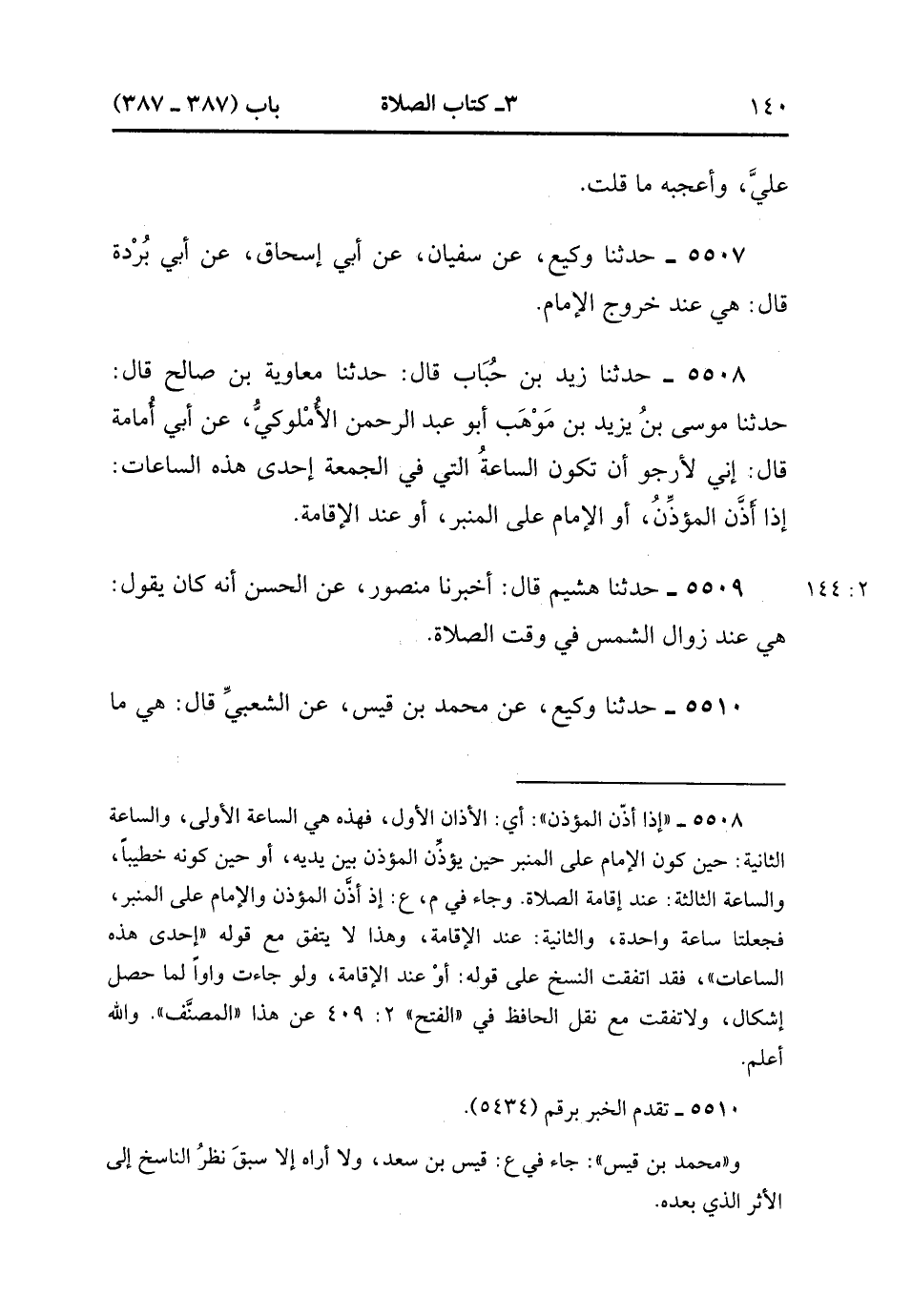 5510- حَدَّثَنَا وَكِيعٌ ، عَنْ مُحَمَّدِ بْنِ قَيْسٍ ، عَنِ الشَّعْبِيِّ ، قَالَ : هِيَ مَا بَيْنَ أَنْ يَحْرُمَ الْبَيْعُ إِلَى أَنْ يَحْلِل. (2/144).