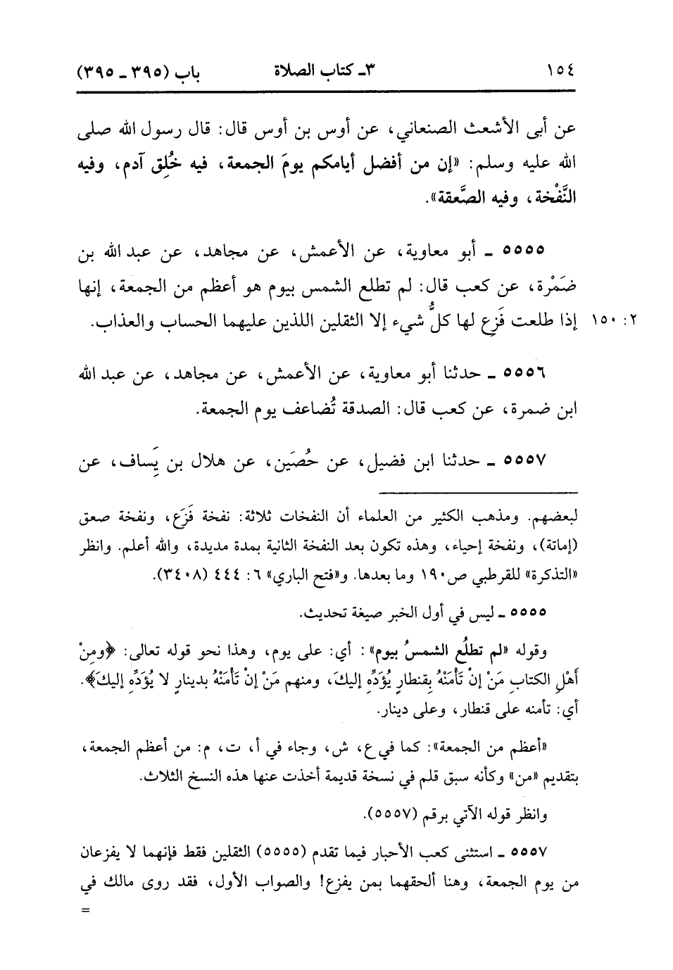 5555- حَدَّثَنَا أَبُو مُعَاوِيَةَ ، عَنِ الأَعْمَشِ ، عَنْ مُجَاهِدٍ ، عَنْ عَبْدِ اللهِ بْنِ ضَمْرَةَ ، عَنْ كَعْبٍ ، قَالَ : لَمْ تَطْلُعَ الشَّمْسُ بِيَوْمٍ هُوَ أَعْظَمُ مِنَ الْجُمُعَةِ ، إِنَّهَا إِذَا طَلَعَتْ فَزِعَ لَهَا كُلُّ شَيْءٍ إِلاَّ الثَّقَلَينِ ، اللَّذيْنِ عَلَيْهِمَا الْحِسَابُ وَالْعَذَابُ. (2/149)