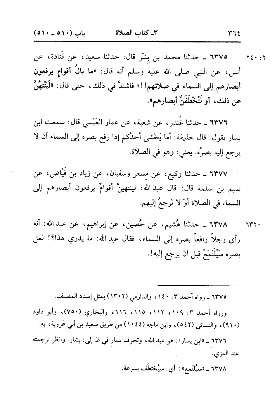 6378- حَدَّثَنَا هُشَيْمٌ ، عَنْ حُصَيْنٍ ، عَنْ إِبْرَاهِيمَ ، عَنْ عَبْدِ اللهِ ؛ أَنَّهُ رَأَى رَجُلاً رَافِعًا بَصَرَهُ إِلَى السَّمَاءِ ، فَقَالَ عَبْدُ اللهِ : مَا يَدْرِي هَذَا ؟ لَعَلَّ بَصَرَهُ سَيَلْتَمِعُ قَبْلَ أَنْ يَرْجِعَ إِلَيْهِ. (2/240).