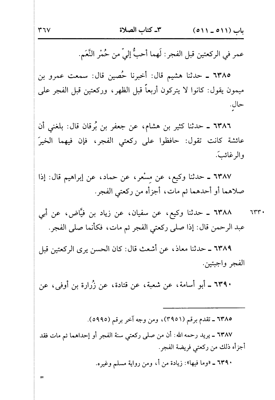 6385- حَدَّثَنَا هُشَيْمٌ , قَالَ : أَخْبَرَنَا حُصَيْنٌ ، قَالَ : سَمِعْتُ عَمْرَو بْنَ مَيْمُونٍ ، يَقُولُ : كَانُوا لاَ يَتْرُكُونَ أَرْبَعًا قَبْلَ الظُّهْرِ ، وَرَكْعَتَيْنِ قَبْلَ الْفَجْرِ عَلَى حَالٍ.