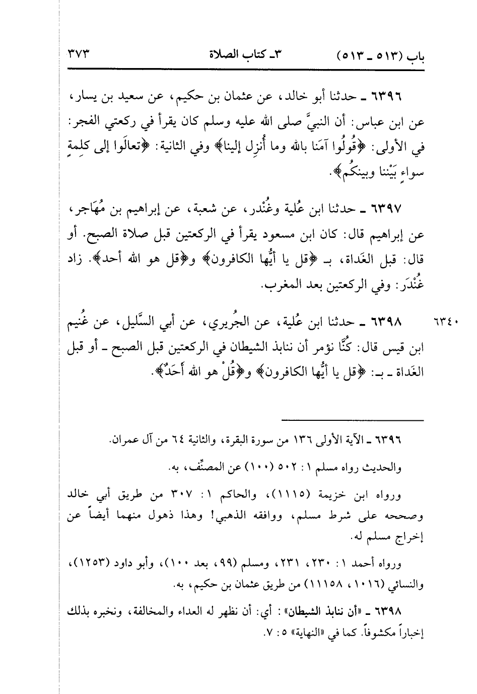 6398- حَدَّثَنَا ابْنُ عُلَيَّةَ ، عَنِ الْجُرَيْرِيِّ ، عَنْ أَبِي السَّلِيلِ ، عَنْ غُنَيْمِ بْنِ قَيْسٍ ، قَالَ : كُنَّا نُؤْمَرُ أَنْ نُنَابِذَ الشَّيْطَانَ فِي الرَّكْعَتَيْنِ قَبْلَ الصُّبْحِ ، أَوْ قَبْلَ الْغَدَاةِ بِـ : {قُلْ يَا أَيُّهَا الْكَافِرُونَ} ، وَ{قُلْ هُوَ اللَّهُ أَحَدٌ}. (2/242).