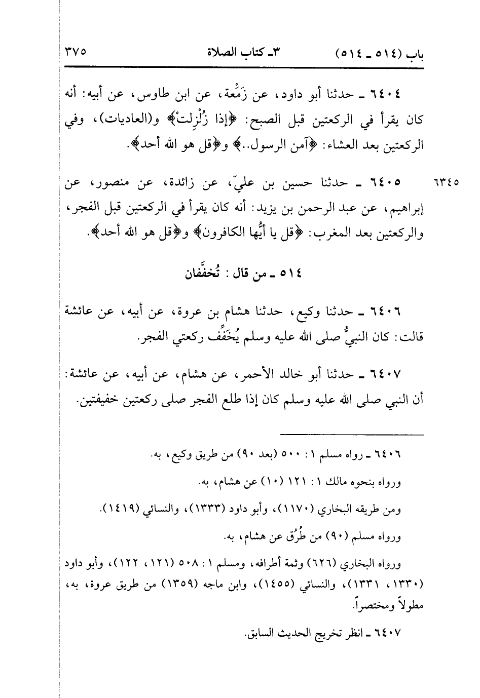 6407- حَدَّثَنَا أَبُو خَالِدٍ الأَحْمَرِِ ، عَنْ هِشَامٍ ، عَنْ أَبِيهِ ، عَنْ عَائِشَةَ ؛ أَنَّ النَّبِيَّ صَلَّى الله عَلَيْهِ وَسَلَّمَ كَانَ إِذَا طَلَعَ الْفَجْرُ صَلَّى رَكْعَتَيْنِ خَفِيفَتَيْنِ. (2/243).