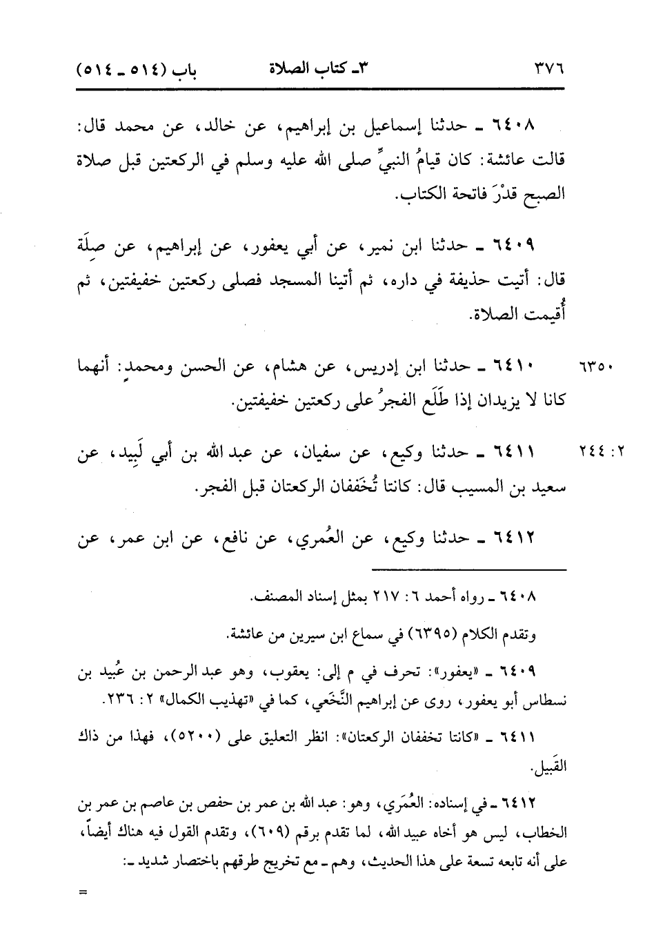6411- حَدَّثَنَا وَكِيعٌ ، عَنْ سُفْيَانَ ، عَنْ عَبْدِ اللهِ بْنِ أَبِي لَبِيدٍ ، عَنْ سَعِيدِ بْنِ الْمُسَيَّبِ ، قَالَ : كَانَتَا تُخَفِّفَانِ الرَّكْعَتَانِ قَبْلَ الْفَجْرِ. (2/244).