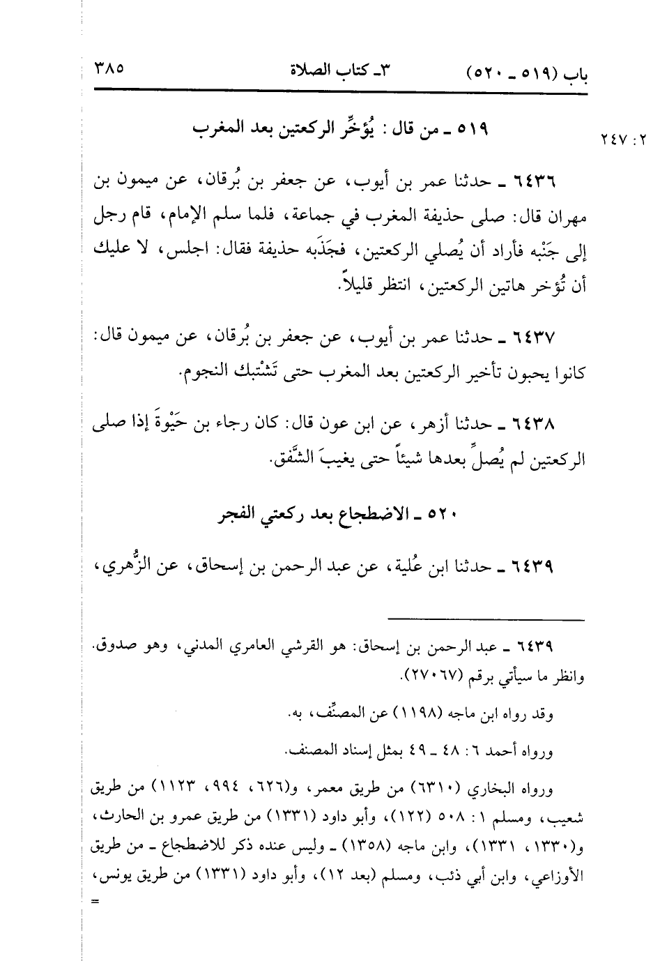6436- حَدَّثَنَا عُمْرُ بْنُ أَيُّوبَ ، عَنْ جَعْفَرَ بْنِ بُرْقَانَ ، عَنْ مَيْمُونِ بْنِ مِهْرَانَ ، قَالَ : صَلَّى حُذَيْفَةُ الْمَغْرِبَ فِي جَمَاعَةٍ ، فَلَمَّا سَلَّمَ الإِمَامُ قَامَ رَجُلٌ إِلَى جَنْبِهِ ، فَأَرَادَ أَنْ يُصَلِّيَ الرَّكْعَتَيْنِ ، فَجَذَبَهُ حُذَيْفَةُ ، فَقَالَ : اجْلِسْ ، لاَ عَلَيْك أَنْ تُؤَخِّرَ هَاتَيْنِ الرَّكْعَتَيْنِ ، انْتَظِرْ قَلِيلاً.