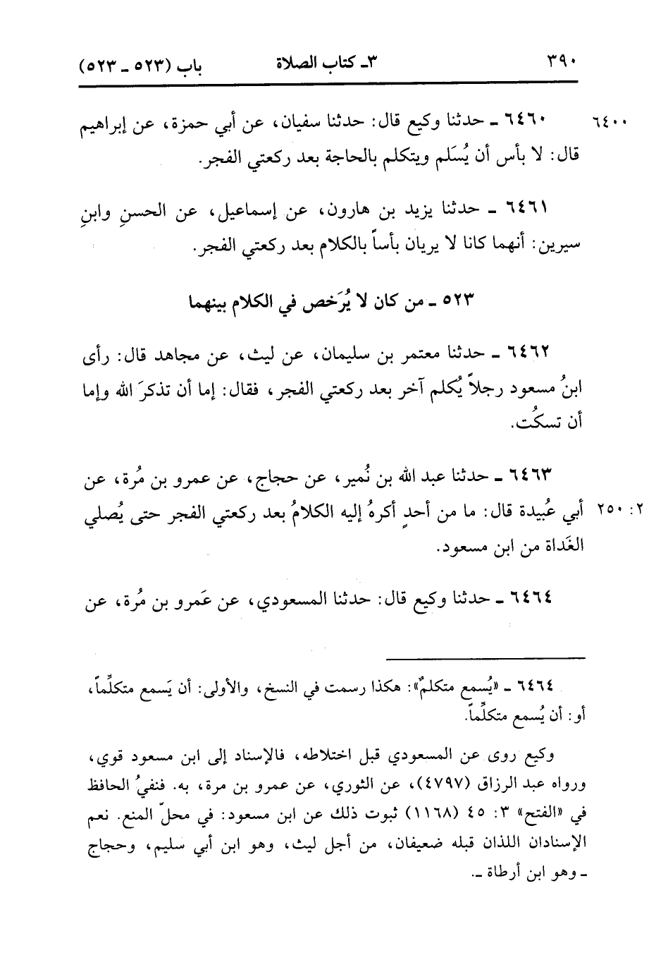 6464- حَدَّثَنَا وَكِيعٌ , قَالَ : حدَّثَنَا الْمَسْعُودِيُّ ، عَنْ عَمْرِو بْنِ مُرَّةَ ، عَنْ أَبِي عُبَيْدَةَ ، قَالَ : كَانَ عَبْدُ اللهِ يَعِزُّ عَلَيْهِ أَنْ يُسْمَعَ مُتَكَلِّمٌ بَعْدَ الْفَجْرِ ، يَعْنِي بَعْدَ الرَّكْعَتَيْنِ ، إِلاَّ بِالْقُرْآنِ ، أَوْ بِذِكْرِ اللهِ ، حَتَّى يُصَلِّيَ. (2/250).