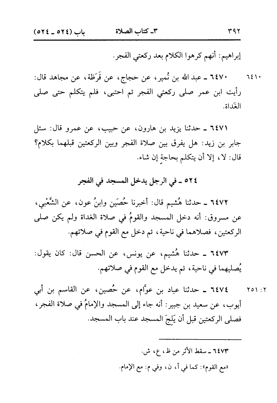 6470- حَدَّثَنَا عَبْدُ اللهِ بْنُ نُمَيْرٍ ، عَنْ حَجَّاجٍ ، عَنْ قَرَظَةَ ، عَنْ مُجَاهِدٍ ، قَالَ : رَأَيْتُ ابْنَ عُمَرَ صَلَّى رَكْعَتَيِ الْفَجْرِ ثُمَّ احْتَبَى ، فَلَمْ يَتَكَلَّمْ حَتَّى صَلَّى الْغَدَاةَ.