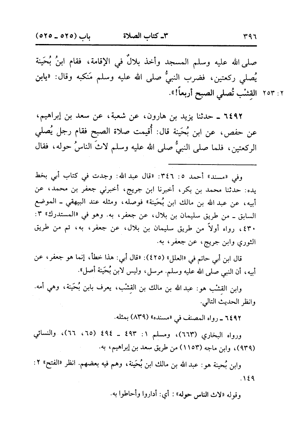 6492- حَدَّثَنَا يَزِيدُ بْنُ هَارُونَ ، عَنْ شُعْبَةَ ، عَنْ سَعْدِ بْنِ إِبْرَاهِيمَ ، عَنْ حَفْصٍ ، عَنِ ابْنِ بُحَينةَ ، قَالَ : أُقِيمَتْ صَلاَةُ الصُّبْحِ ، فَقَامَ رَجُلٌ يُصَلِّي الرَّكْعَتَيْنِ ، فَلَمَّا صَلَّى النَّبِيُّ صَلَّى الله عَلَيْهِ وَسَلَّمَ لاَثَ النَّاسُ حَوْلَهُ ، فَقَالَ رَسُولُ اللهِ صَلَّى الله عَلَيْهِ وَسَلَّمَ لِلَّذِي صَلَّى الرَّكْعَتَيْنِ : أَتُصَلِّي الصُّبْحَ أَرْبَعًا ؟. (2/253).