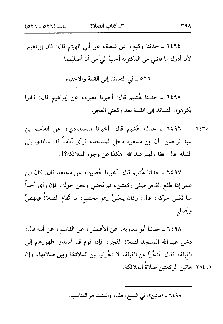 6495- حَدَّثَنَا هُشَيْمٌ , قَالَ : أَخْبَرَنَا مُغِيرَةُ ، عَنْ إِبْرَاهِيمَ ، قَالَ : كَانُوا يَكْرَهُونَ التَّسَانُدَ إِلَى الْقِبْلَةِ بَعْدَ رَكْعَتَيِ الْفَجْرِ.