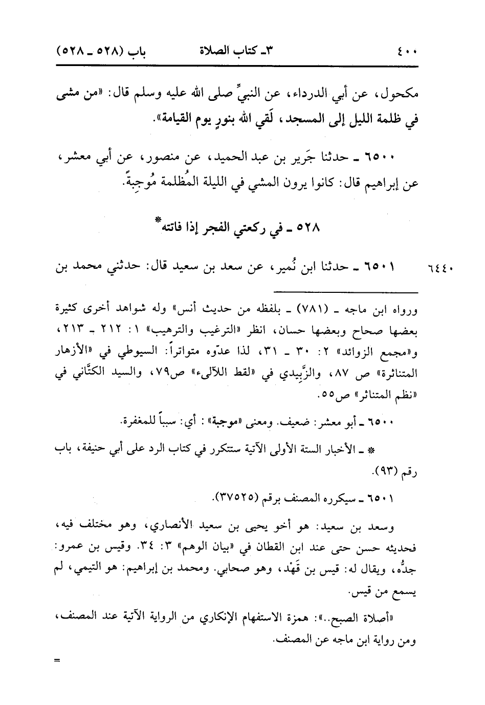6500- حَدَّثَنَا جَرِيرُ بْنُ عَبْدِ الْحَمِيدِ ، عَنْ مَنْصُورٍ ، عَنْ أَبِي مَعْشَرٍ ، عَنْ إِبْرَاهِيمَ ، قَالَ : كَانُوا يَرَوْنَ الْمَشْيَ فِي اللَّيْلَةِ الْمُظْلِمَةِ مُوجِبَةً. (2/254).