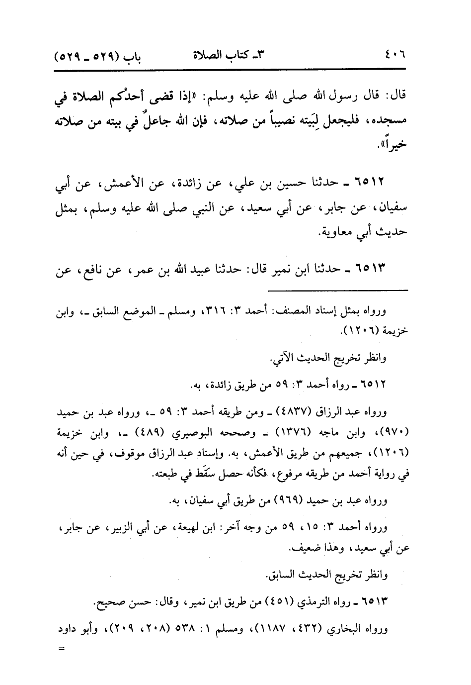 6513- حَدَّثَنَا ابْنُ نُمَيْرٍ , قَالَ : حدَّثَنَا عُبَيْدُ اللهِ بْنُ عُمَرَ ، عَنْ نَافِعٍ ، عَنِ ابْنِ عُمَرَ ، عَنِ النَّبِيِّ صَلَّى الله عَلَيْهِ وَسَلَّمَ ، أَنَّهُ قَالَ : صَلُّوا فِي بُيُوتِكُمْ ، وَلاَ تَتَّخِذُوهَا قُبُورًا. (2/255).