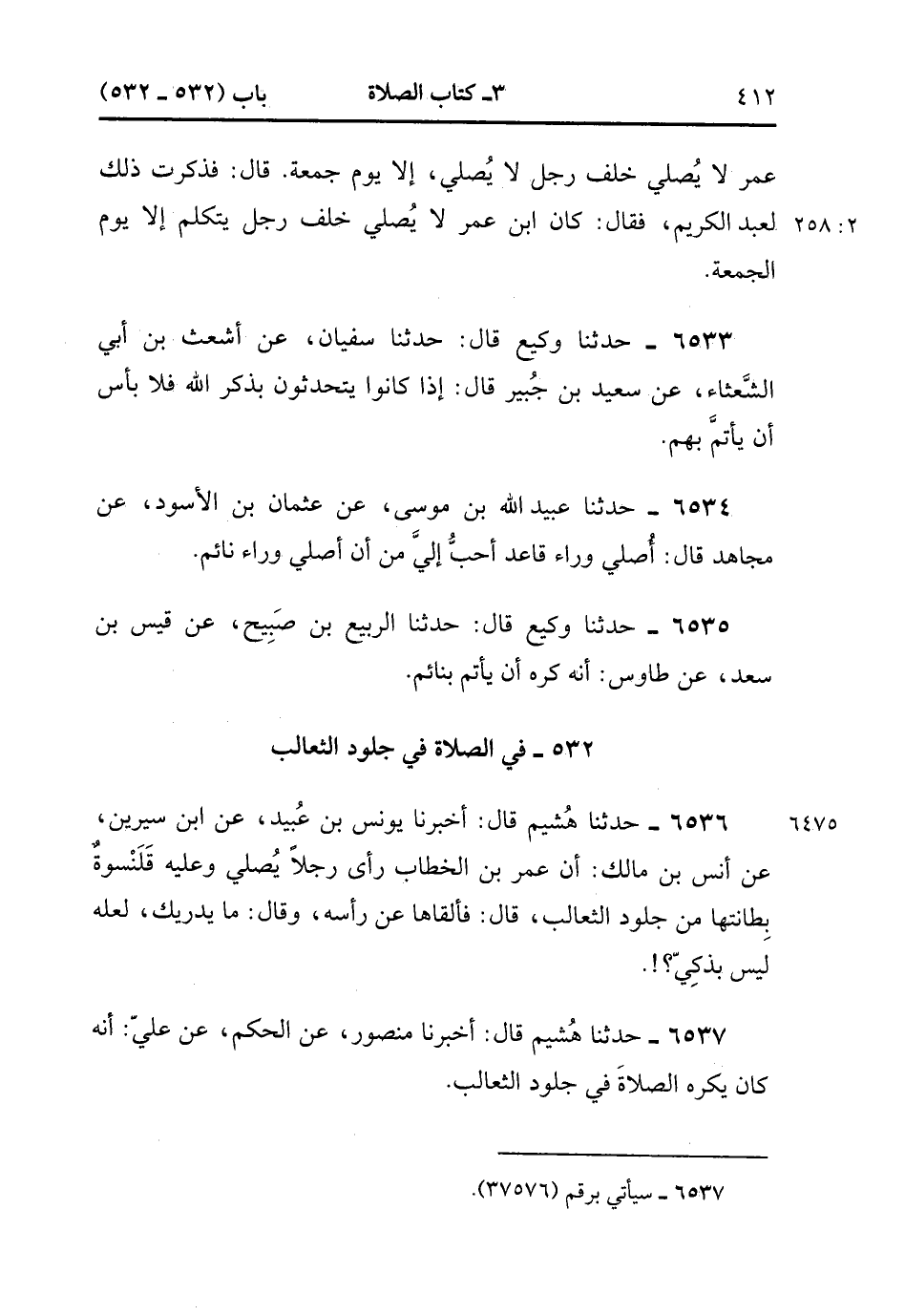 6537- حَدَّثَنَا هُشَيْمٌ , قَالَ : أَخْبَرَنَا مَنْصُورُ ، عَنِ الْحَكَمِ ، عَنْ عَلِيٍّ ؛ أَنَّهُ كَانَ يَكْرَهُ الصَّلاَة فِي جُلُودِ الثَّعَالِبِ. (2/258).