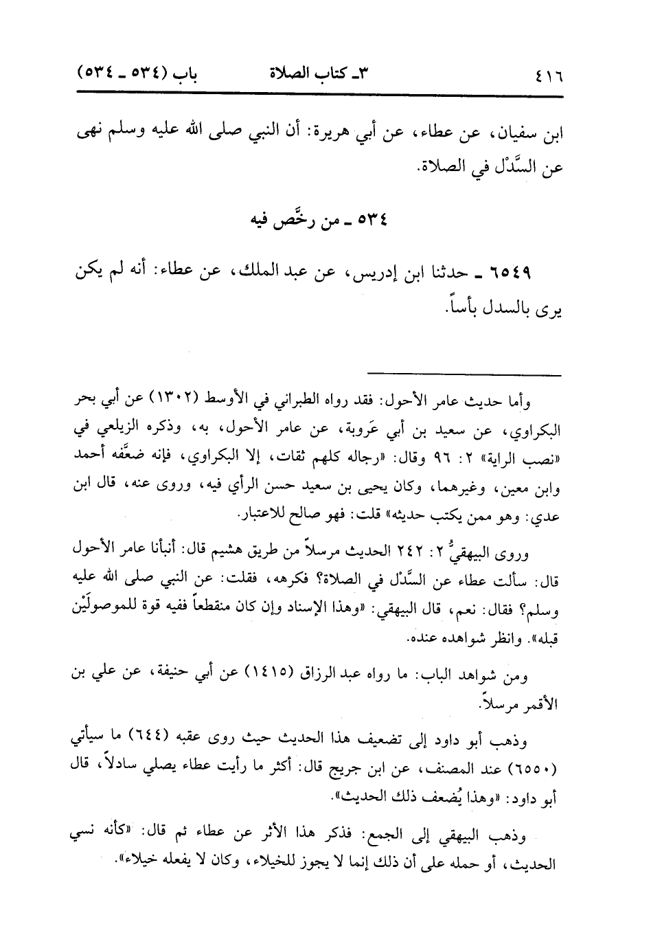6549- حَدَّثَنَا ابْنُ إِدْرِيسَ ، عَنْ عَبْدِ الْمَلِكِ ، عَنْ عَطَاءٍ ؛ أَنَّهُ لَمْ يَكُنْ يَرَى بِالسَّدْلِ بَأْسًا. (2/259).